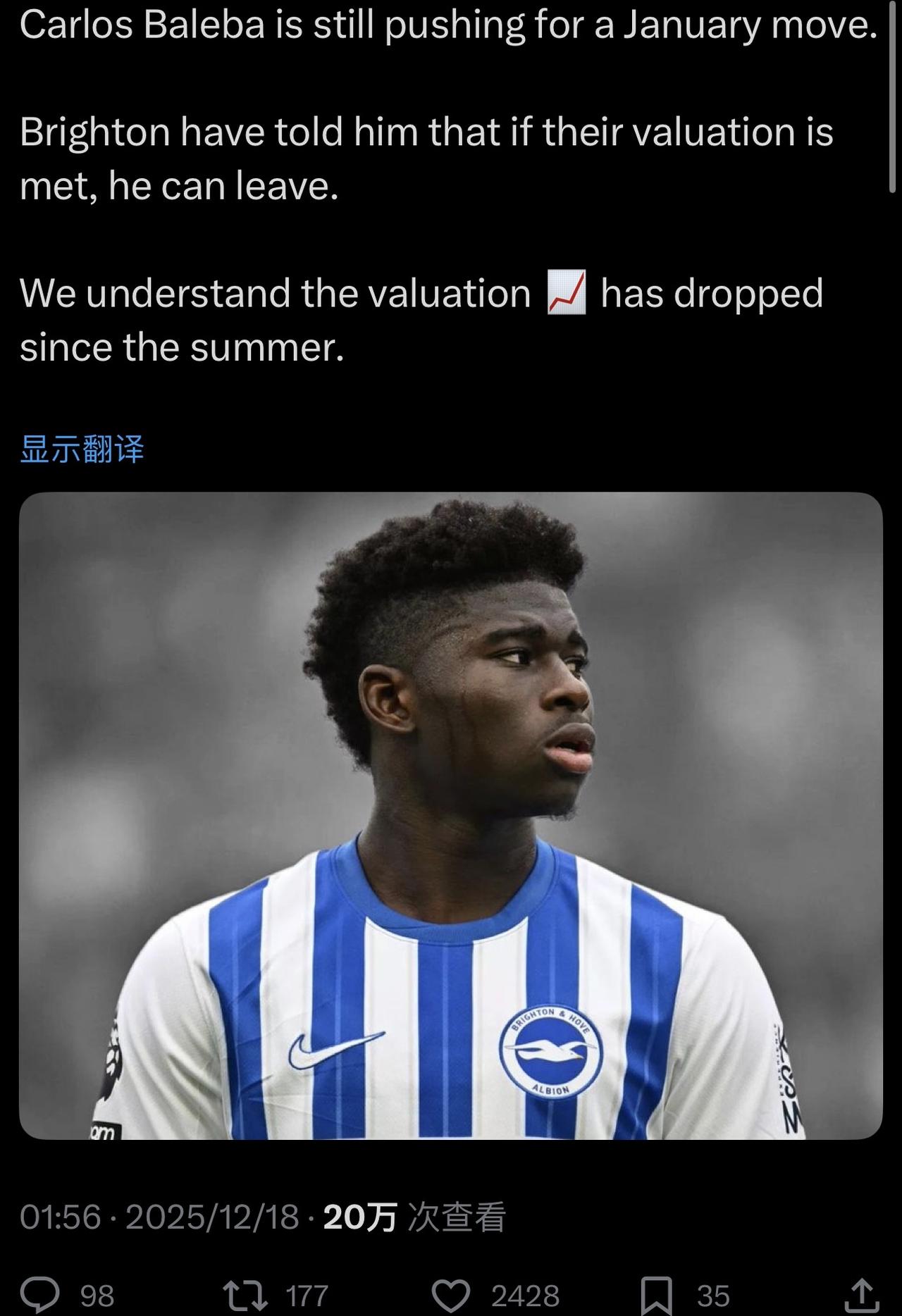 繁花看尽 心似浮云 1 2025-12-18 14:22 巴莱巴自己推动一下,6000万镑成交 lpy813 回复 12-18 14:30 另外两个目标打曼联跟打了鸡血一样,这个直接半赛季梦游,这投名状交的可大发了。