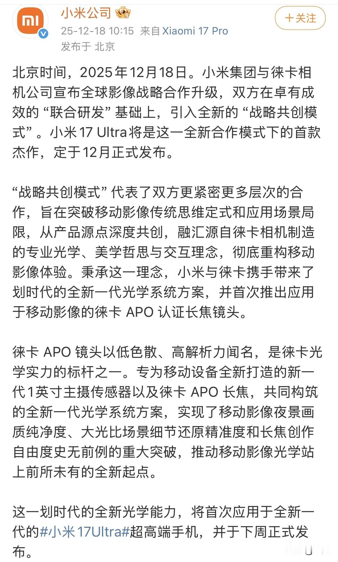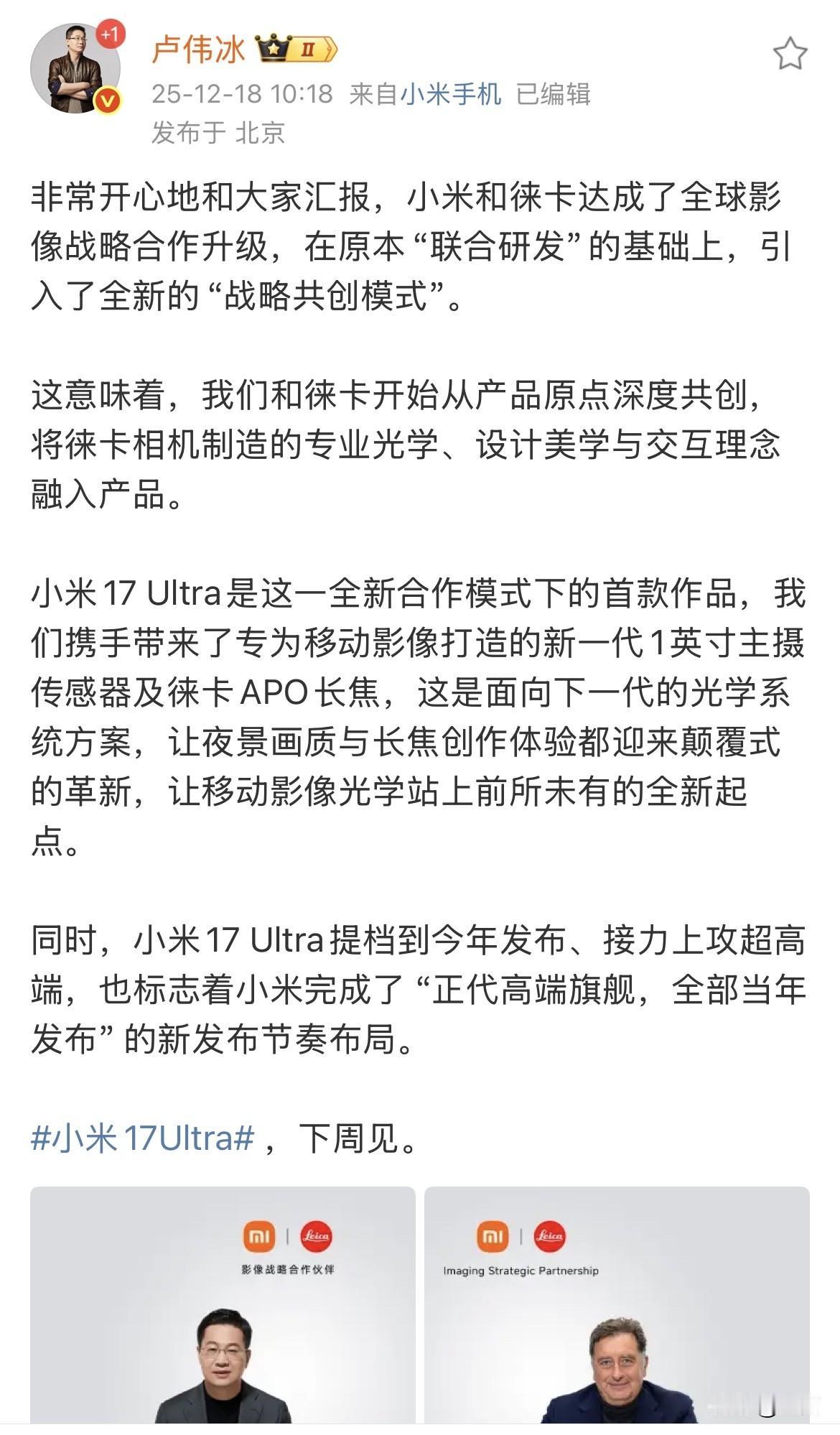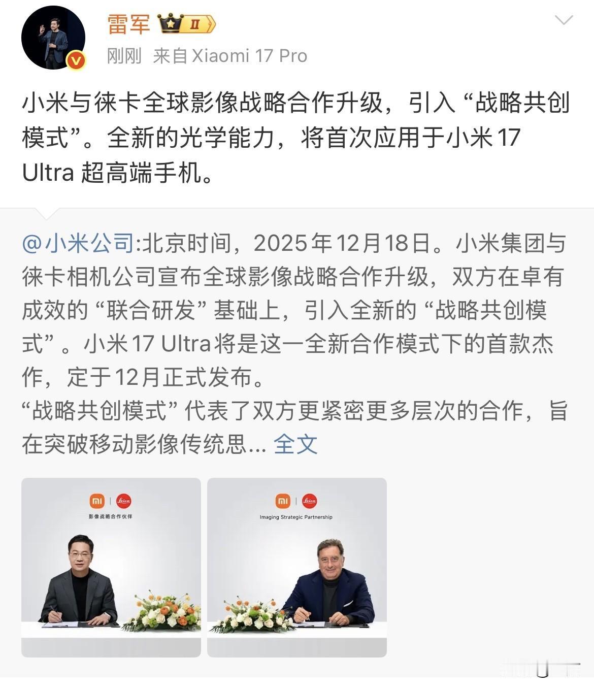 雷军:小米与徕卡全球影像战略合作升级,引入 “战略共创模式”。 就在刚才,雷军在社交网络,引用了小米官方的一篇报道,这个报道当中有两张照片,一张是卢伟冰,一张是徕卡相机的老板,他们两个一起端端正正的坐在签字台上。 右手拿着笔,准备继续签战略合作的合同,而且两张照片上面还专门标记的地点,卢伟冰这张照片的地点在北京,而莱卡老板的照片在德国,他们两个之所以用这种方式来合作,是因为接下来小米的一款新手机,将继续和徕卡合作。 而且这一次合作和以前不一样了,他们两个在影像基础上的合作会更加的深,最终出来的效果将应用于小米17 Ultra 手机上面。 卢伟冰也在社交网络上,对这个事情进行了详细的说明。 根据以往他们推新手机的规律来看,估计这个手机很快就会和大家见面了 ,但是目前还没有人知道这个手机长什么样子,以及详细的配置和售价都还没有出来。 估计在很快的时间大家就能看到了,到时候看看,这一款当下小米最好的手机到底长什么样子。