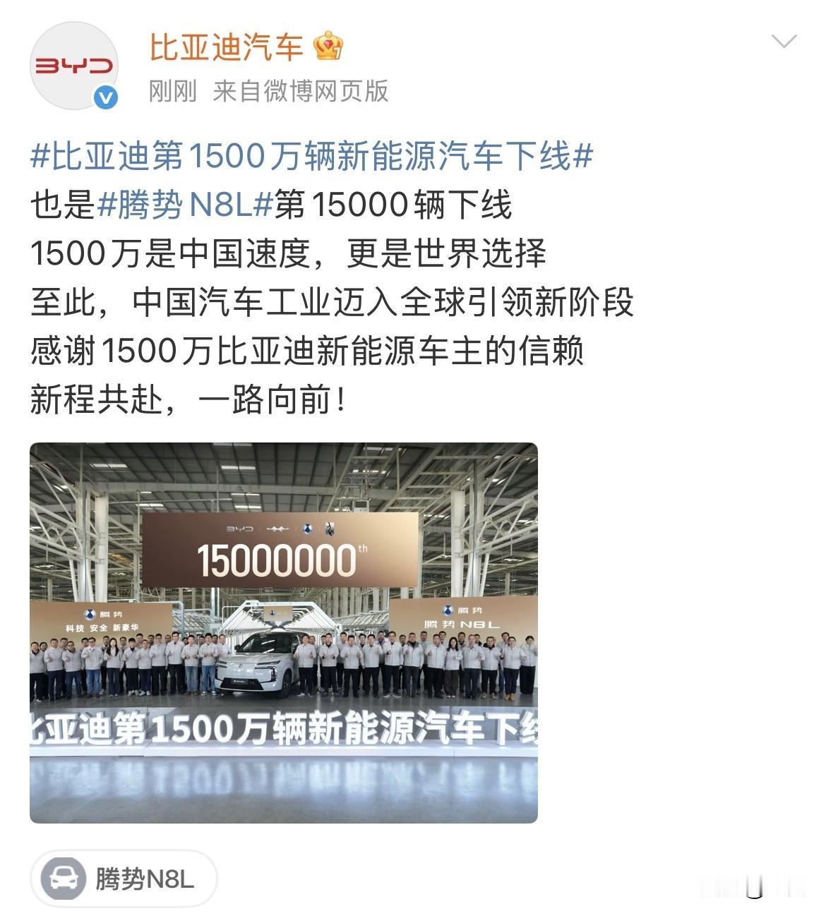 比亚迪:我们第1500万辆新能源汽车下线了! 就在刚才,比亚迪的官方社交网络,