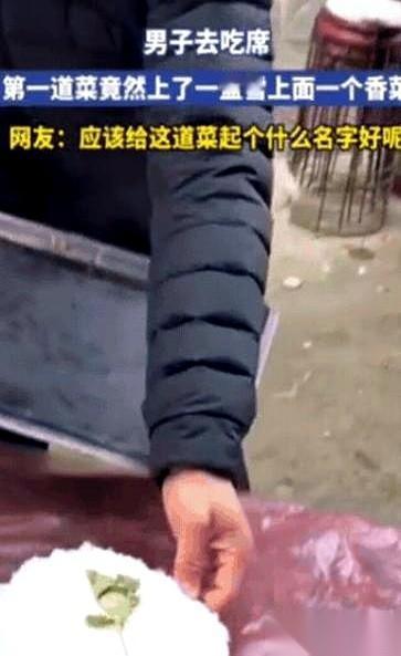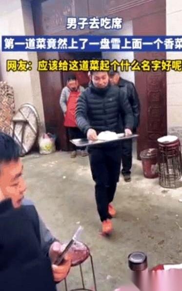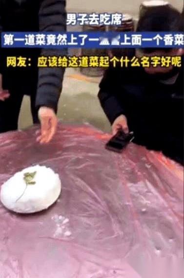 一盘子雪,上面插根香菜。 就这?这就是河南大席的第一道菜? 我当时就傻了,手里筷子都不知道往哪儿放。 哥们儿为了这顿席,愣是饿了一上午,就喝了碗稀饭。脑子里全是肘子、烧鸡、大鲤鱼在开会,就等着开席一声令下,冲锋陷阵呢。 结果服务员推着车过来,我们一个个伸长了脖子,跟迎接什么宝贝似的。 “咣当”一声,盘子放桌中间了。 全场寂静。 我看着那盘白花花的雪,又看了看旁边大哥脸上从期待到迷茫再到“你在逗我”的表情,差点没绷住。 这叫什么? 行为艺术? 旁边的大叔反应快,凑过去闻了闻,摇摇头笑了:“活大半辈子,吃过凉菜,没吃过冷空气啊。” 一下全桌人都乐了,尴尬算是化解了。 年轻人开始掏手机拍照,现场给这道“神菜”起名。什么“踏雪寻梅”,什么“冰清玉洁”,还有人说这叫“千里江陵一点绿”…… 说真的,文化人就是不一样,一个冷笑话愣是给整出了诗意。 看着服务员那憋着笑的样儿,就知道是主家搞的鬼,想活跃气氛。 创意是挺有创意的。 但在咱这儿,吃席是天大的事,是人情,是脸面,更是实实在在的尊重。 说白了,大家随份子钱,不是为了来看你表演小品的。 我肚子咕咕叫的时候,你给我看再美的雪景,它也不顶饿啊。 任何花里胡哨的形式主义,在红烧肉面前,都显得那么苍白无力,甚至,有点冒犯。