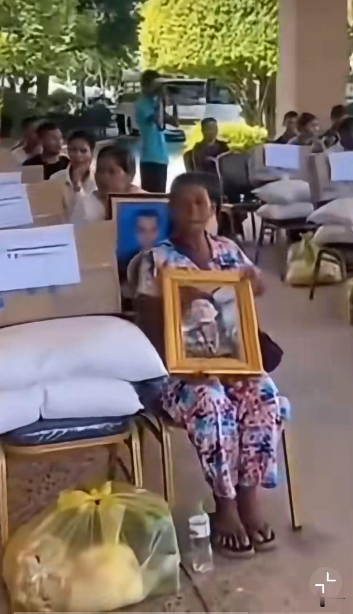 这些柬埔寨阵亡士兵的家属捧着亲人的遗像,表情落寞的他们坐在那里,陪伴在他们身边的不是曾经的亲人。而是两袋米,一箱方便面,和十瓶鱼露。这是政府为阵亡的柬埔寨士兵家属提供的抚恤金。 而这些家属可能再也见不上死去亲人最后一面了。因为这些阵亡的士兵被遗弃了,他们的遗体不知道在什么地方。 遭到国际社会批评的柬埔寨说想将抚恤金提到5万美元,但没有钱,希望得到国际援助,来解决资金问题。 但柬埔寨首相洪森个人却佩戴价值超过10亿美元的名表,让人们很愤慨。更有士兵感叹自己到底“为何而战”。