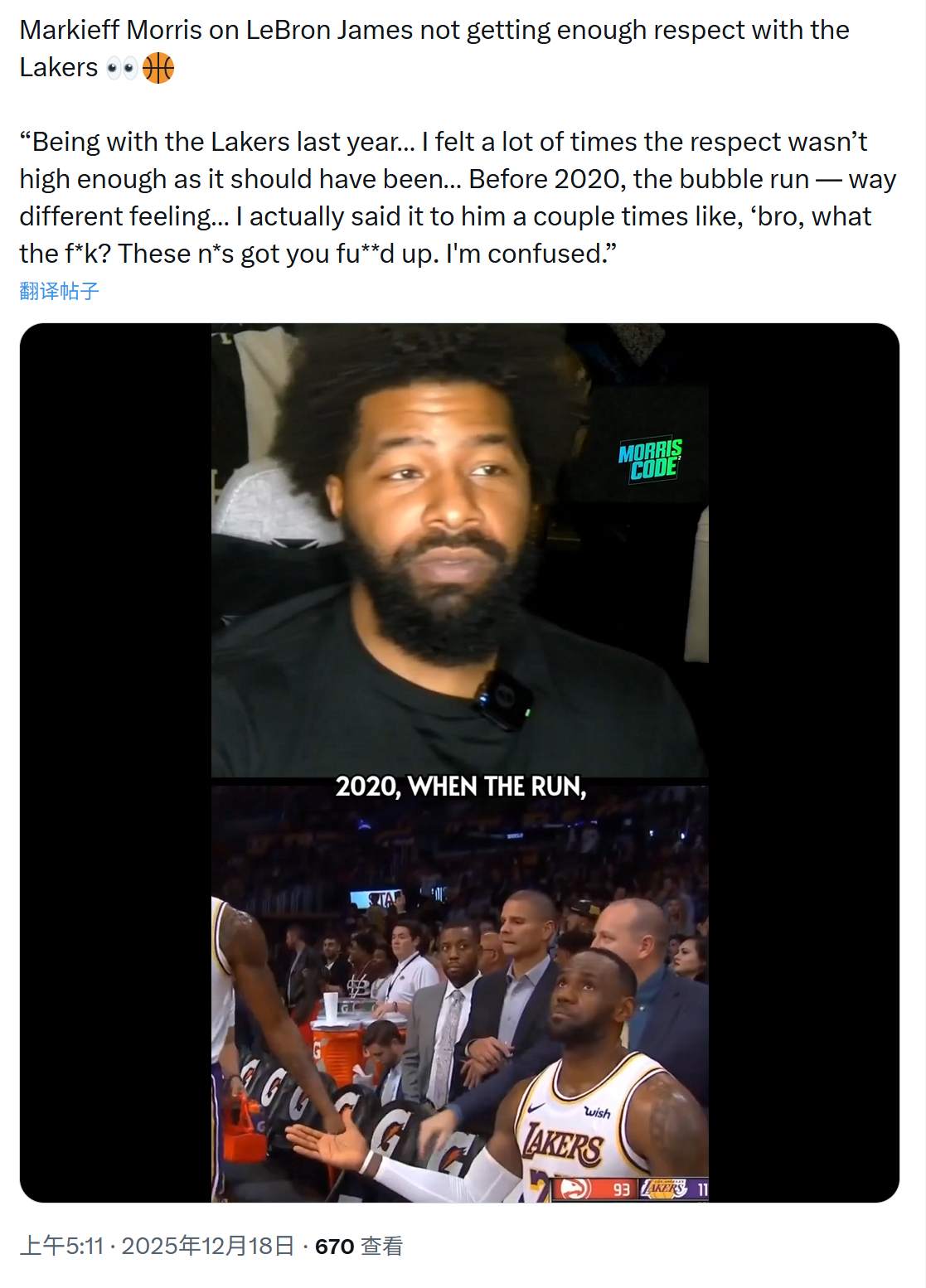 从小甜甜到牛夫人前湖人球员马基夫·莫里斯在播客里谈去年的湖人:“在湖人的上个赛季,我感觉很多时候对勒布朗的尊重并没有达到应有的程度。我可以这么说,在2020年园区复赛期间的感觉不同,完全不一样。如今,你湖人确实得到了卢卡,但我就是觉得尊重程度不够。我甚至好几次对勒布朗说,‘兄弟,这是怎么回事?这些人把你搞得很惨,我感到很困惑。’”