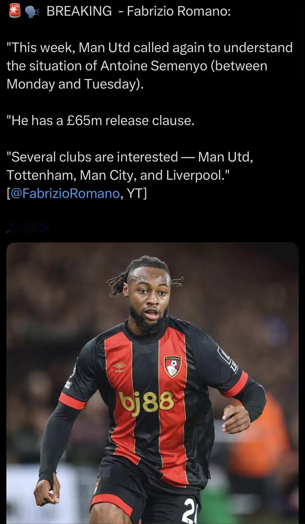我个人会将塞梅尼奥和齐尔克泽的转会捆绑起来看。 🔴因为只有卖掉齐尔克泽,曼联才会考虑买塞梅尼奥,但只有塞梅尼奥同意加盟曼联,曼联才会考虑卖掉齐尔克泽[捂脸] 🔴据说罗马买齐尔克泽的谈判,进展很顺利。 🔴但塞梅尼奥目前只考虑加盟利物浦[流泪] ……………………………………………………………… “本周,曼联再次致电了解安托万·塞梅尼奥的情况(周一至周二之间)。 “他的解约金条款为 6500 万英镑。” “有好几家俱乐部都对他感兴趣——曼联、托特纳姆热刺、曼城和利物浦。