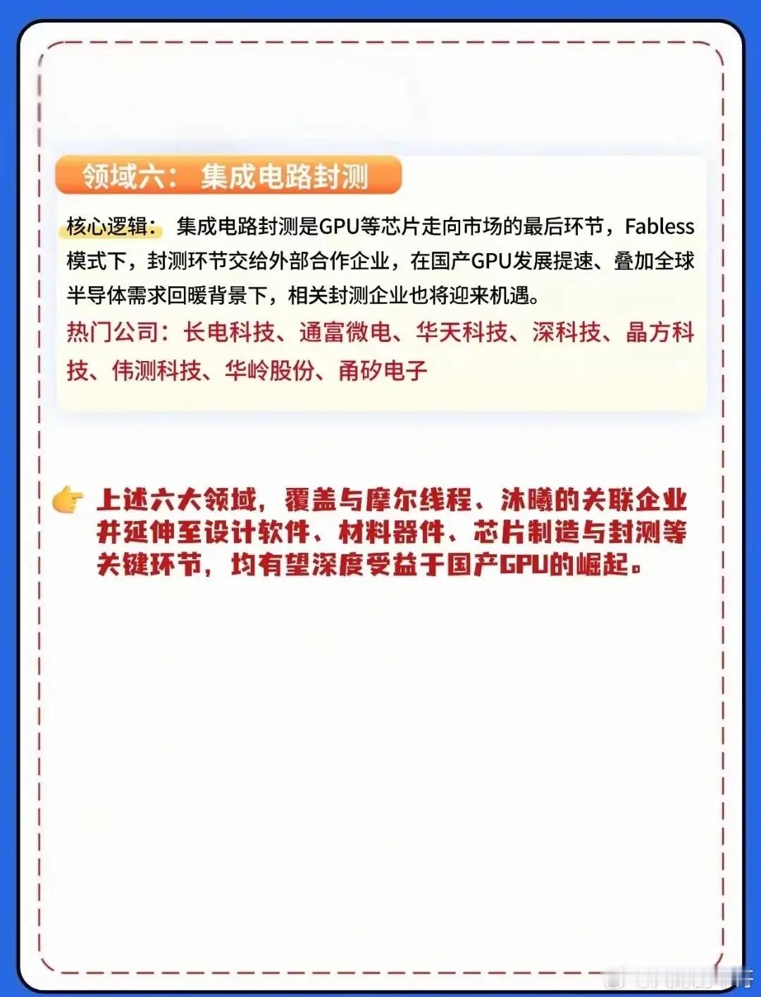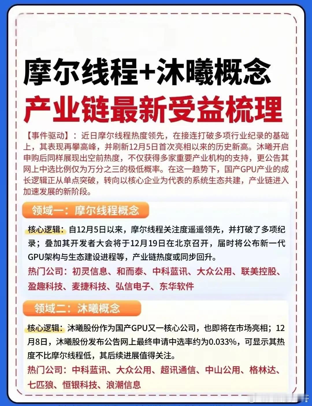 国产GPU风口已至!摩尔线程、沐曦热度拉满,产业链六大领域迎来爆发机遇,相关概念龙头代表有哪些?沐曦股份17日登陆科创板,是国产高端GPU里程碑事件。盘中一度涨超700%,市值突破3300亿元,成为国产GPU“第二股”。沐曦集成概念龙头代表:浪潮信息、中山公园、超讯通讯等等。摩尔线程开发者大会将于12月20-21日在北京中关村举办,大会主题“创造·链接·汇聚”,这是国内首个聚焦全功能GPU的开发者盛会。相关概念人气代表:东华软件、中科蓝讯、和而泰等等。
