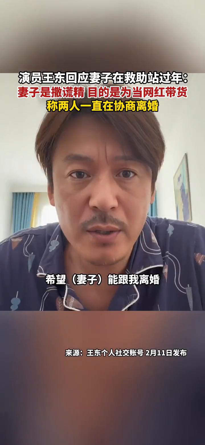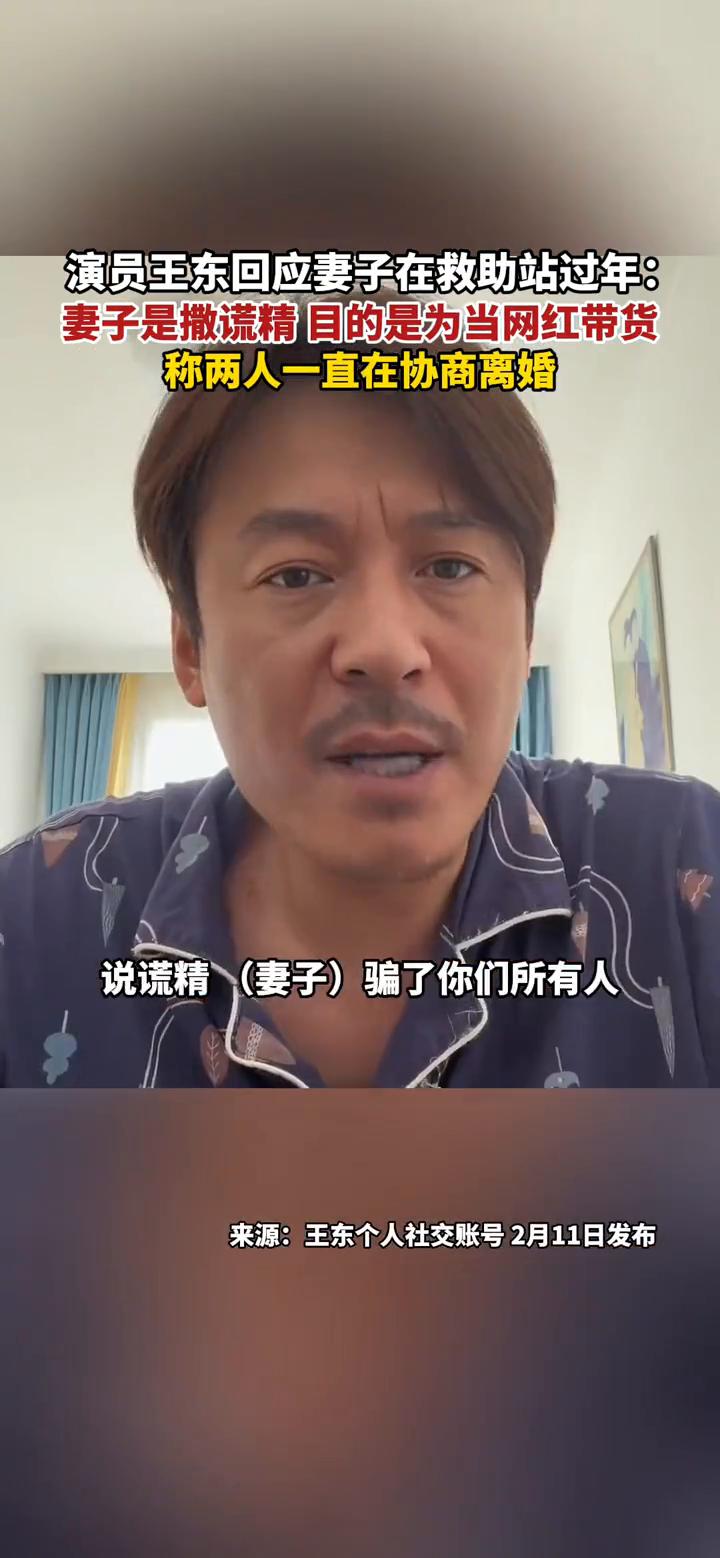 演员王东回应妻子在救助站过年:妻子是撒谎精,目的是为当网红带货,称两人一直在协商离婚。 来源:王东个人社交账号。 大家好,我是王东。(妻子)是一个骗子,彻头彻尾的大骗子,说谎精(妻子)骗了你们所有人。(妻子)的目的非常明确,(妻子)就是想当网红去带货,(希望妻子)不要再拿孩子当筹码、当工具了,孩子是无辜的。希望(妻子)能跟我离婚,有被(妻子)攻击过的痕迹。