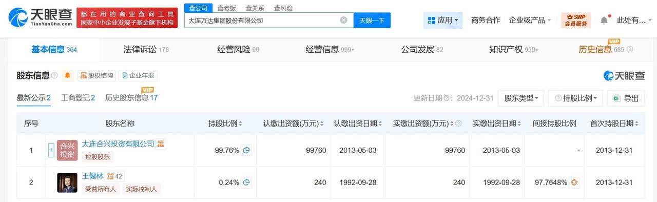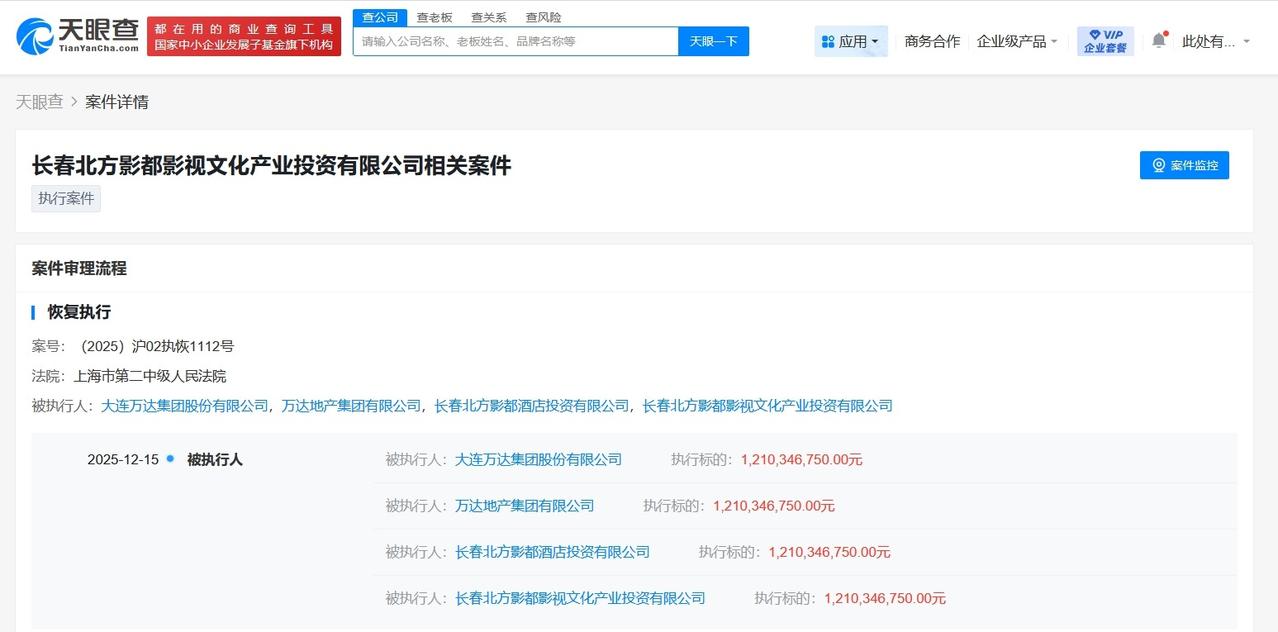 万达集团及万达地产等被恢复执行12亿 天眼查App显示,近日,大连万达集团股份有限公司、万达地产集团有限公司等新增一则恢复执行信息,执行标的12亿余元,执行法院为上海市第二中级人民法院。 大连万达集团股份有限公司成立于1992年9月,法定代表人为王健林,注册资本10亿人民币,由大连合兴投资有限公司、王健林共同持股。天眼风险信息显示,该公司现存12条被执行人信息,被执行总金额81亿余元,此外,该公司还存在多条股权冻结信息。 天眼查信息: