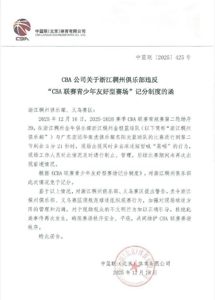 今日CBA官方发布关于浙江稠州俱乐部违反“CBA联赛青少年友好型赛场”记分制度的函。