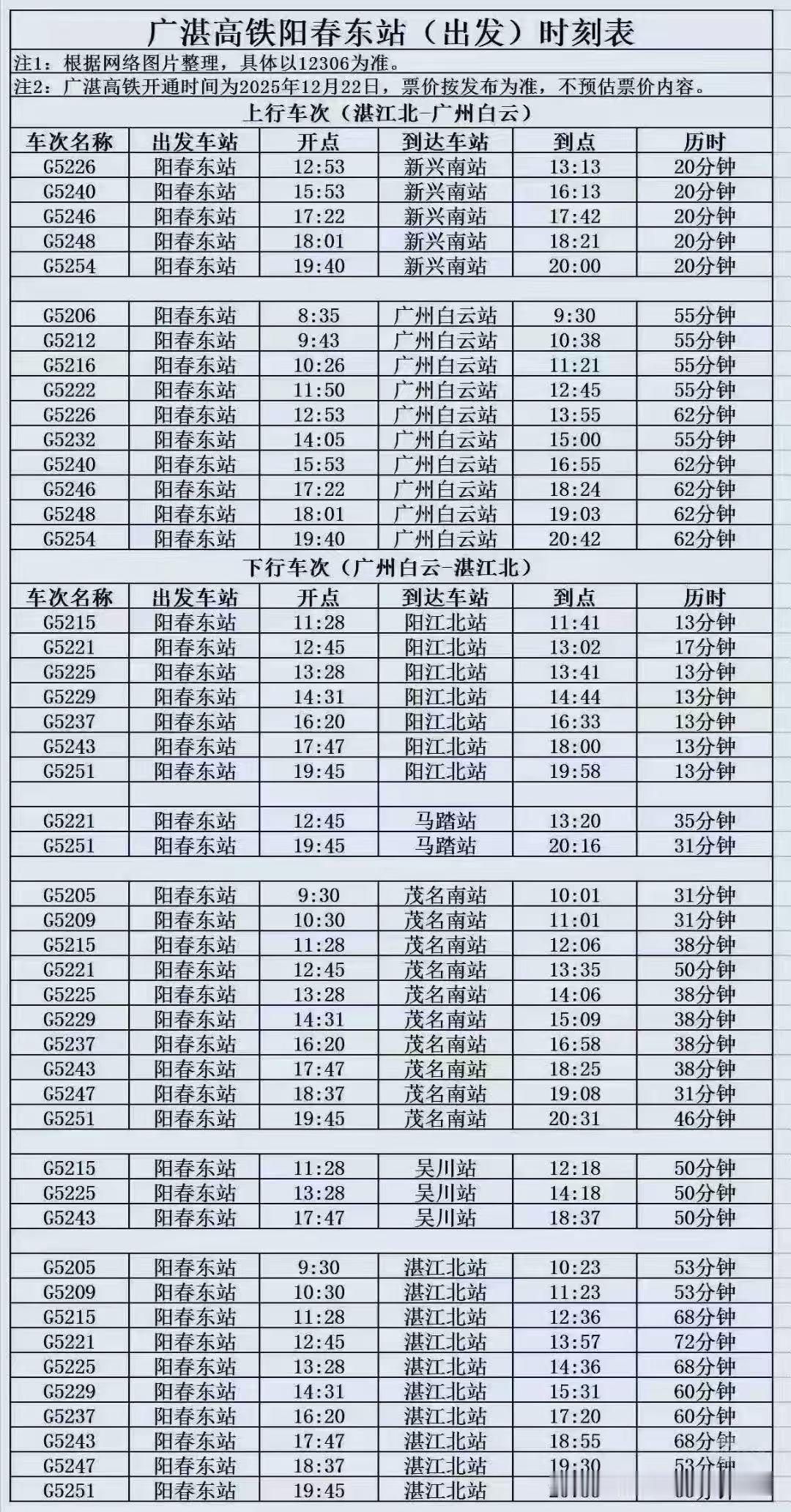 广湛高铁阳江(阳春东站)收车时间太早了! 1. 开通时间 广湛高铁计划于2025年12月22日开通,具体车次、票价以12306官方发布为准。 2. 车次方向与主要站点耗时 - 上行(湛江北→广州白云):阳春东站到新兴南站约20分钟;到广州白云站耗时55~62分钟,到广州南站20分钟(仅G5254次)。 - 下行(广州白云→湛江北):阳春东站到阳江北站约13分钟;到茂名南站最快31分钟;到湛江北站最快53分钟(G5205、G5209、G5247次),最慢68分钟。 3. 车次频次特点 上行往广州方向的车次从8:35至19:40均有发车,间隔约1小时左右;下行往湛江北方向的车次从9:30至19:45发车,覆盖白天主要出行时段!