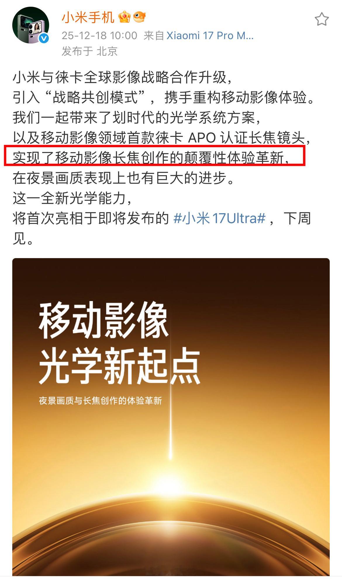 小米17Ultra官宣下周见,划重点:实现了移动影像长焦创作的颠覆性体验革新,1英寸+2亿长焦影像机皇,长焦创作自由度史无前例的重大突破,可能不止一款,小米也要有自己的非凡大师了 小米17Ultra下周发布