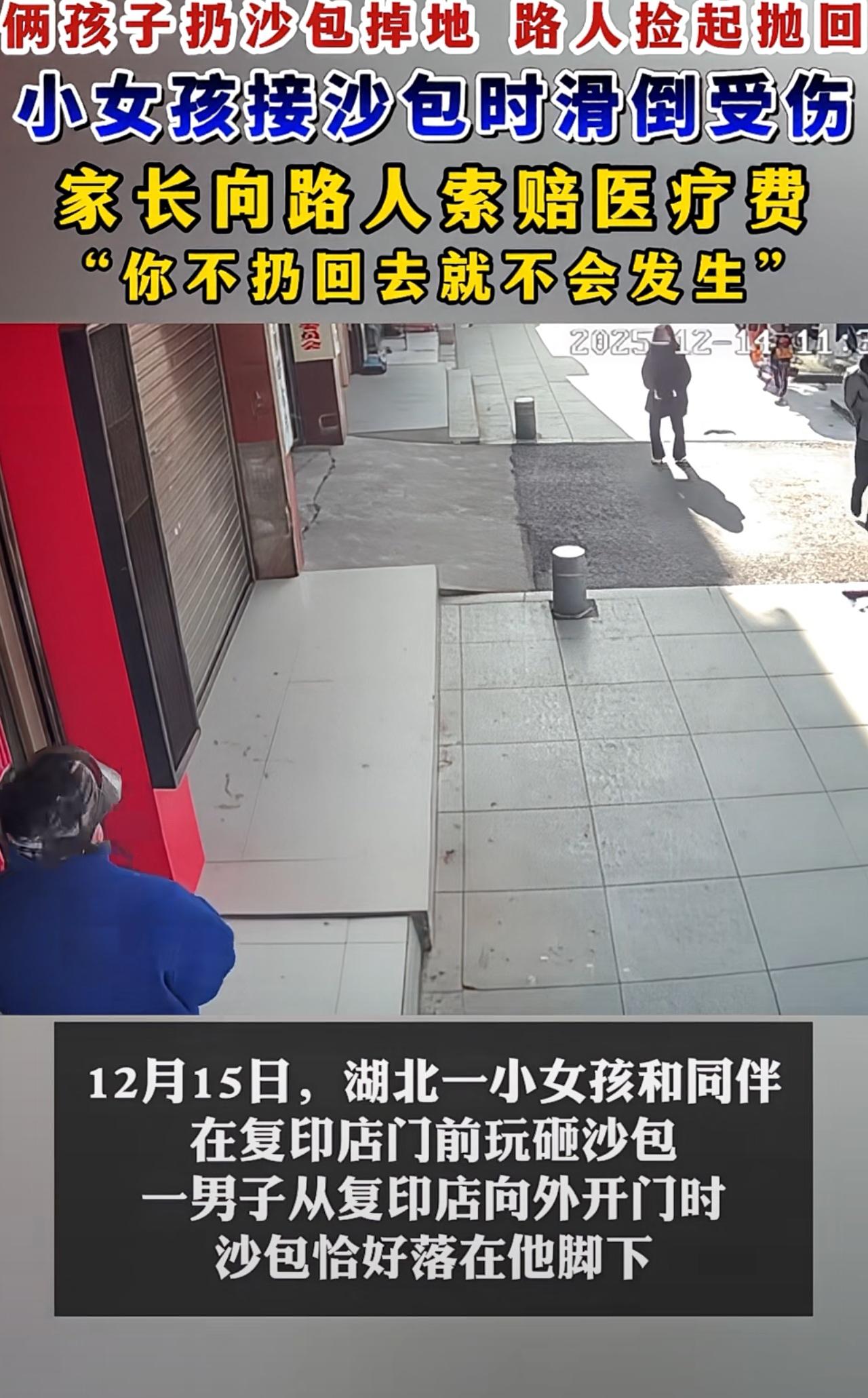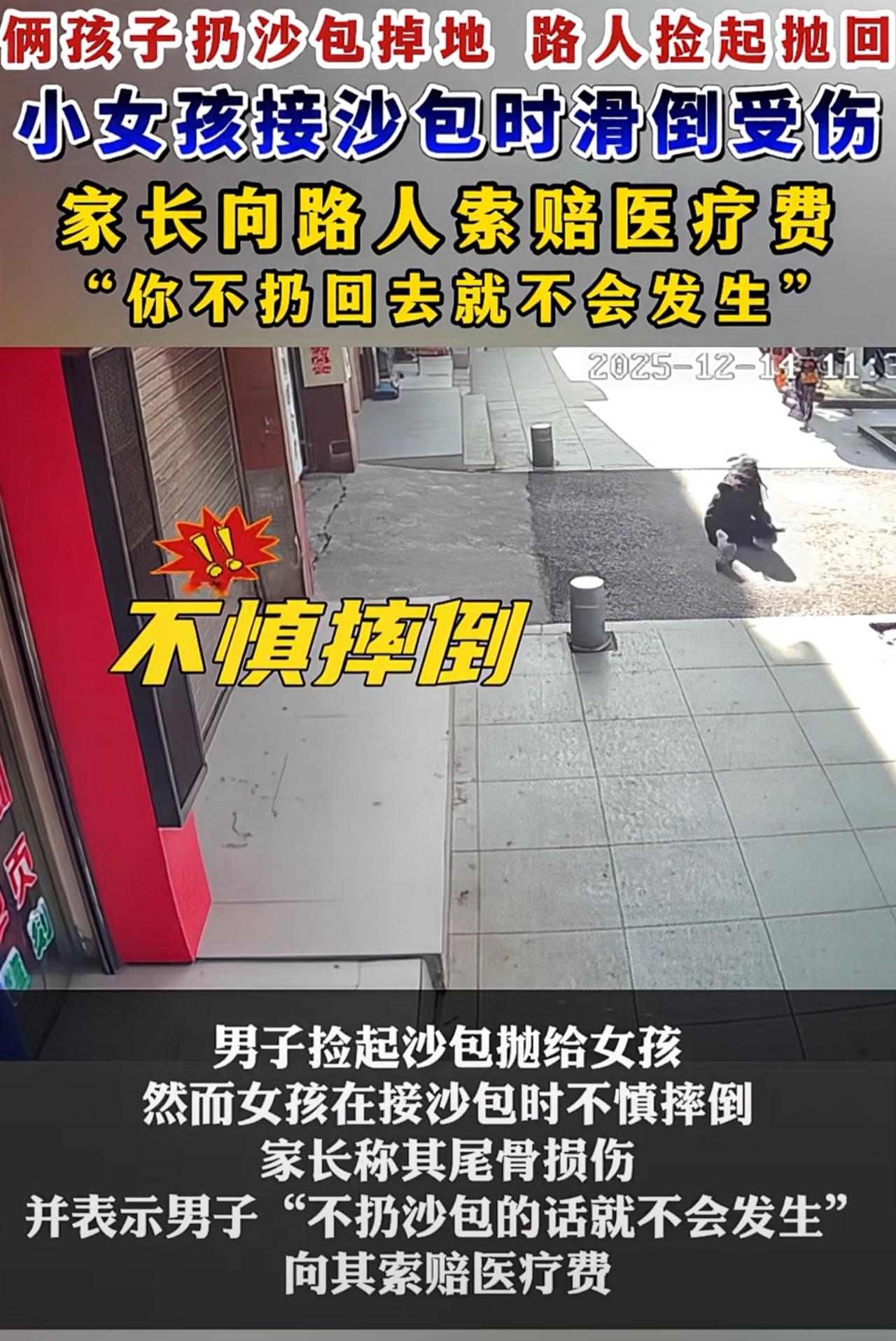 近期湖北发生的事,路人大叔好心办坏事,被家长强词夺理索赔! 俩孩子扔沙包掉地上, 路人刚好走过好心捡起抛回,并且在女孩准备好的情况下, 小女孩接沙包时不慎滑倒受伤 ,家长向路人索赔医疗费,理由是:“如果你不往回扔沙包的话,我闺女不会受伤,现在尾椎骨损伤!” 从医院检查看只是肿了,骨头没事,没有骨裂,骨折情况,按理说只是小问题,花不了几个钱,一般人也就过去了,恰恰相反的举措处置方式,惊呆网友,这不三天了热度还没下去。 到底路人该不该认赔!