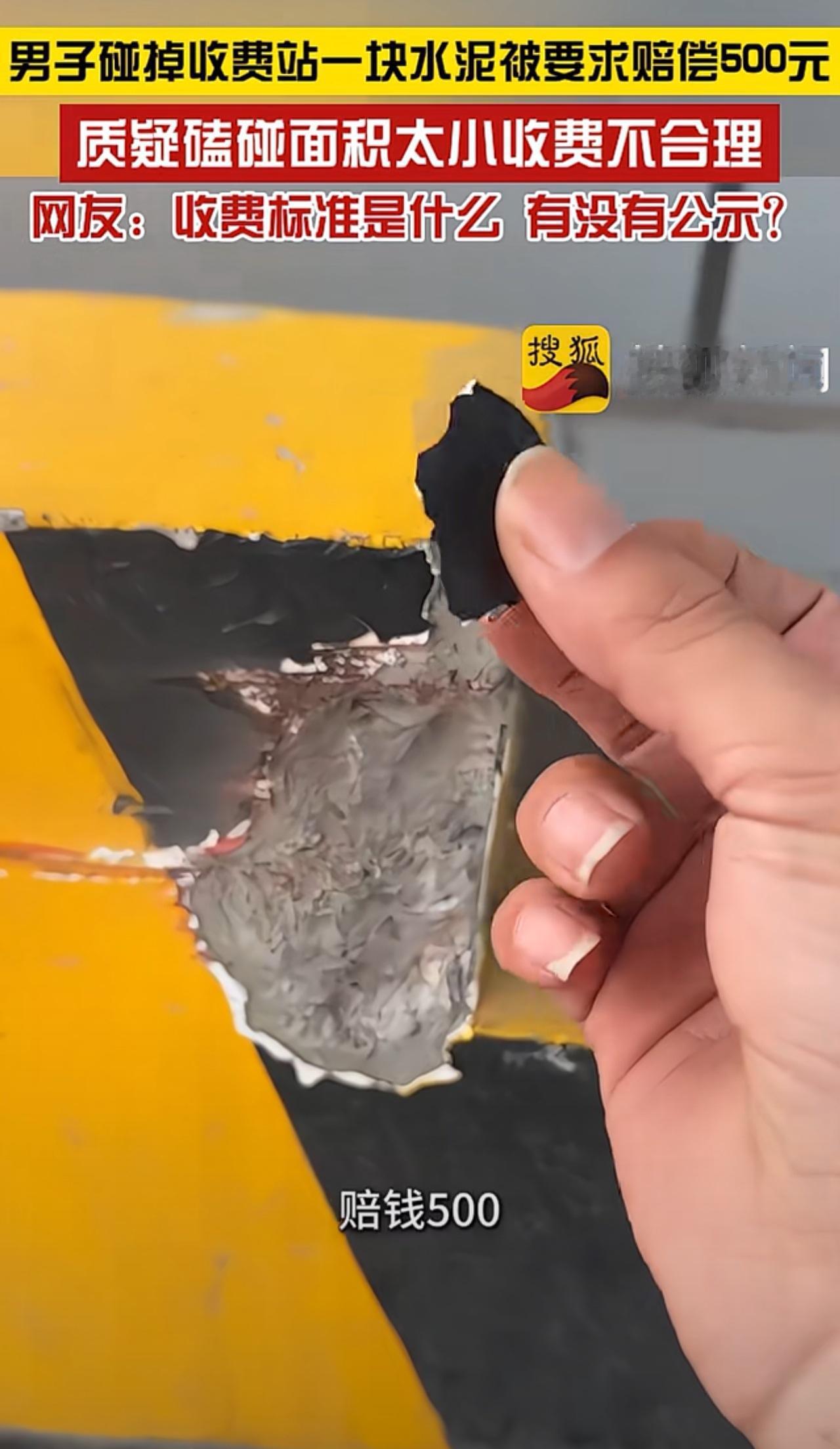 近日浙江男子碰掉收费站一块水泥被要求赔偿500元,质疑磕碰面积太小收费不合理。男子拿着拇指大水泥块气愤道:“看看这个…出口,就扔掉这么大的一块,就要赔500元,走…的时候注意到啊。” 男子全程录像虽然没说不赔,但是明显感觉男子严重不满,不想做这个冤大头。 你怎么看?