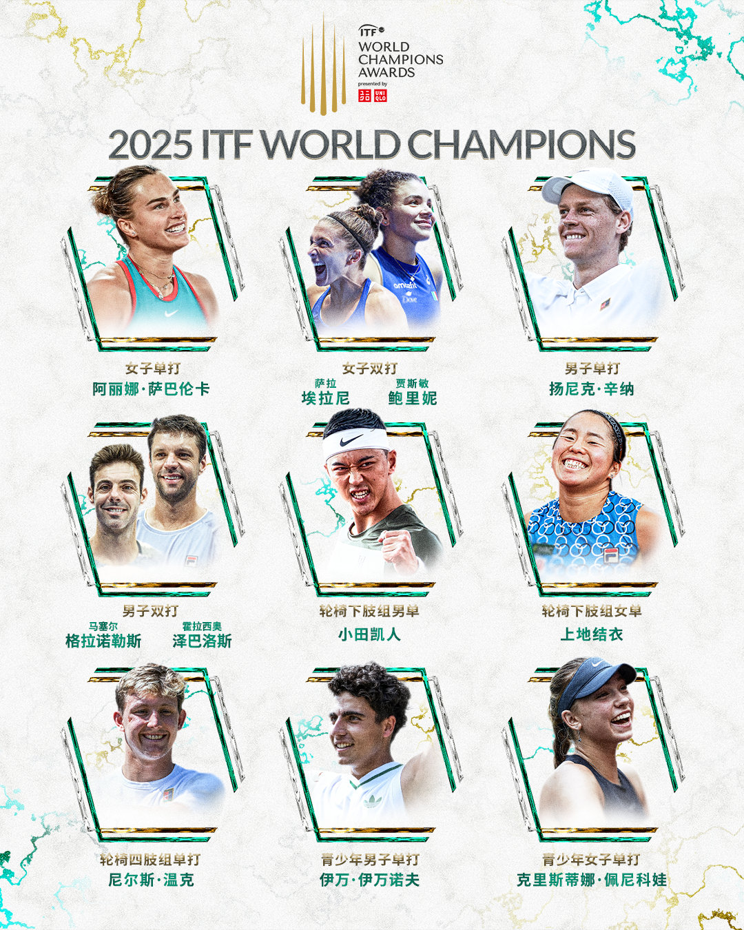 2025ITF世界冠军奖颁布👏🏆女单:萨巴伦卡男单:辛纳女双:埃拉尼/鲍里妮男双:格拉诺勒斯/泽巴洛斯轮椅下肢组男单:小田凯人轮椅下肢组女单:上地结衣轮椅四肢组单打:温克青少年男单:伊万诺夫青少年女单:K·佩尼科娃网球 萨巴伦卡辛纳获ITF世界冠军奖