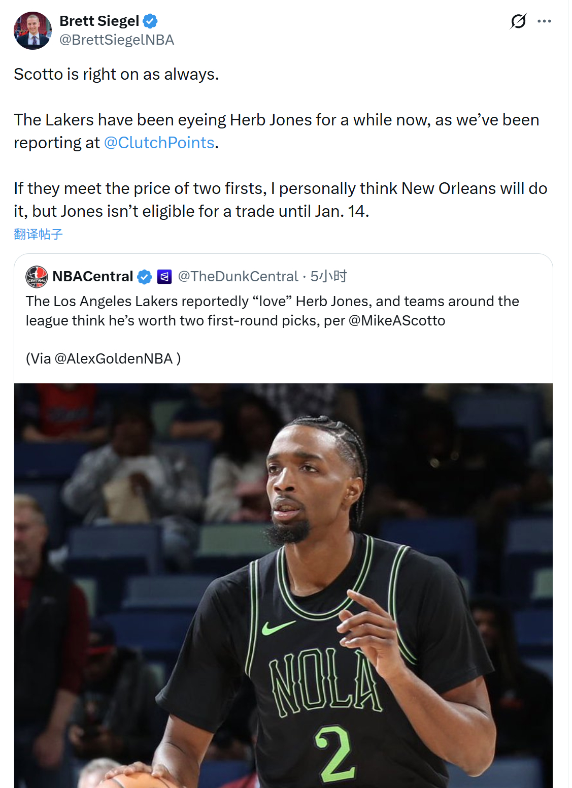 Brett Siegel转发早些时候Michael Scotto的报道,Scotto的消息无误,湖人已经关注赫伯·琼斯一段时间了,如果他们愿意付出2个首轮签,Siegel相信鹈鹕愿意放手,但赫伯·琼斯要到1月15日才有资格被交易。