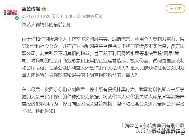 丝芭说鞠婧祎涉嫌严重经济犯罪,将公开举报。 看来这是彻底的撕破脸了。 不知道结局如何,但是我认为应该没有赢家。 解约的事儿就怕纠缠不清,互相耽误,互相影响。 具体内情只能吃瓜,但是还是希望互相理智处理。 一别两宽,各自欢喜。