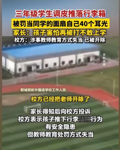 山东郓城,校园楼梯台阶上,一个三年级的学生,看到一个行李箱,调皮的他,一脚踹过去,行李箱滚落台阶,幸好没有伤到别的学生,班主任知道后,就罚他当着全班同学的面,自扇40个耳光,心疼孩子的家长,就投诉班主任,班主任被开除了。 星期天的晚上,周强一家人温馨地吃过晚饭,周强就让三年级的孩子赶紧写作业,明天还要上学,孩子磨磨蹭蹭,却不愿意去写作业,他说:“我不写作业,我不去学校,我害怕!” 周强的妻子听了,感到莫名其妙,以为孩子在学校被同学欺负了,就赶紧心疼地问孩子:“你在害怕什么?” 孩子这才一五一十地将自己的遭遇告诉父母。 原来在12月12日的中午,小周在校园里玩耍,在一个楼梯的台阶上,撒欢的他,突然停了下来。 他好奇地盯着一个行李箱,他歪着小脑袋在思考了片刻,这行李箱怎么会出现在校园里呢? 正好他没什么东西可玩,他看着一级一级的台阶,突然一个好玩的想法冒了出来。 他的腿一蹬,就将行李箱踢下台阶,完全不顾台阶下有学生,人来人往。 所幸的是,行李箱在滚落的过程中,同学们都嬉笑着躲开了,没有人受伤,小周也一笑而过,一溜烟地跑开了。 但这件事没有结束,教室里,班主任逮住了小周,当他知道调皮的小周,干了这么一件危险的事情,他恼怒了。 他不敢自己动手打小周,就小周自己动手,当着全班同学的面,自己扇自己40个耳光。 当小周那小小的巴掌落到自己的脸上,力气不轻不重,但他依然感到脸是热辣辣的疼,他更是感到自己的自尊心被自己扇落在地上,他抬不起头,他不知道自己扇了自己多少下。 直到老师和同学们说,已经扇够了40个,他才停了下来。 他捂着红彤彤的脸,回到座位上,剩下的课,他不知道老师在讲什么,他只希望赶紧上完下午的课,周末放学回家,他再也没脸面对自己的同学和老师了。 那一个周末,小周都不知道自己是怎么度过,他不敢把自己做的事情告诉爸妈妈,或许小周觉得是自己做错了事,所以老师才要这样罚他的,他害怕自己说出来,爸爸妈妈会再批评教育他一次,他选择了默不作声。 但这个周末,他在心惊胆战中度过,他害怕,害怕再去到学校,害怕被老师批评,害怕被同学们嘲笑。 可他终究还是要去上学的,作业还是要做的,该来的还是来了,爸爸要他写作业了,第二天他就要去上学了,他就要去面对自己害怕的一切了。 可他面对爸爸妈妈关心的眼神,那一刻,他真的绷不住了,他这才将自己的委屈,一五一十地告诉爸爸妈妈。 周强和妻子得知,自己的孩子居然要当着全班同学的面,自扇40个耳光,那一刻他们非常气愤。 那一刻,他们只觉得老师带头在欺负学生,那一刻,他只觉得孩子太受委屈了,孩子内心的痛苦,他们无法想象。 他们的孩子才三年级,一个三年级的孩子,居然要当着那么多同学的面,自扇自己耳光,这对孩子的自尊心,造成了多大的影响,他们无法想象孩子当时的心情,到底有多糟糕。 他们只觉得老师这么做是不对的,老师不能这么教训孩子,他们要为孩子讨个公道,于是就向学校投诉了这个班主任。 事后,学校回复道,孩子的行为是存在危险隐患的,老师的教育行为也是不当的,所以他们学校已经开除了老师。 发生这样的事情,学校只是开除了老师而已,并没有给家长一个合理的说法,周强和妻子依然感到心里不舒服,这件事对孩子的心理影响实在是太大了。 他们依然无法想象,孩子当时心里遭受了怎样的创伤,更不知道这件事,又将会影响孩子多长的时间,他们不知道如何帮孩子,消除这件事对孩子的影响。 那么周强该怎么办呢? 1、老师让学生自扇自己40个耳光,这变相体罚。 《未成年人保护法》第21条规定,学校、幼儿园、托管所的教职员工应当尊重未成年人的人格尊严,不得对未成年人实施体罚、变相体罚或者其他侮辱人格尊严的行为。 老师的行为是不当的,那么老师就应当受到一定的处罚。 2、这件事,老师是不对的,他是有一定过错的。 《民法典》第1165条规定:行为人因过错侵害他人民事权益造成损害的,应当承担侵权责任。 老师有过错,那么老师就应当承担过错责任。 3、这件事如果给孩子带来了心灵创伤,那么家长可以为孩子要求精神赔偿。 《民法典》第1183条规定,侵害自然人人身权益造成严重精神损害的,被侵权人有权请求精神损害赔偿。 发生这样的事情,孩子害怕去学校,还有可能厌学,确实给孩子造成很大的伤害。 那么你是如何看待孩子的这件事情呢?来源:西安晚报 2025年12月18日