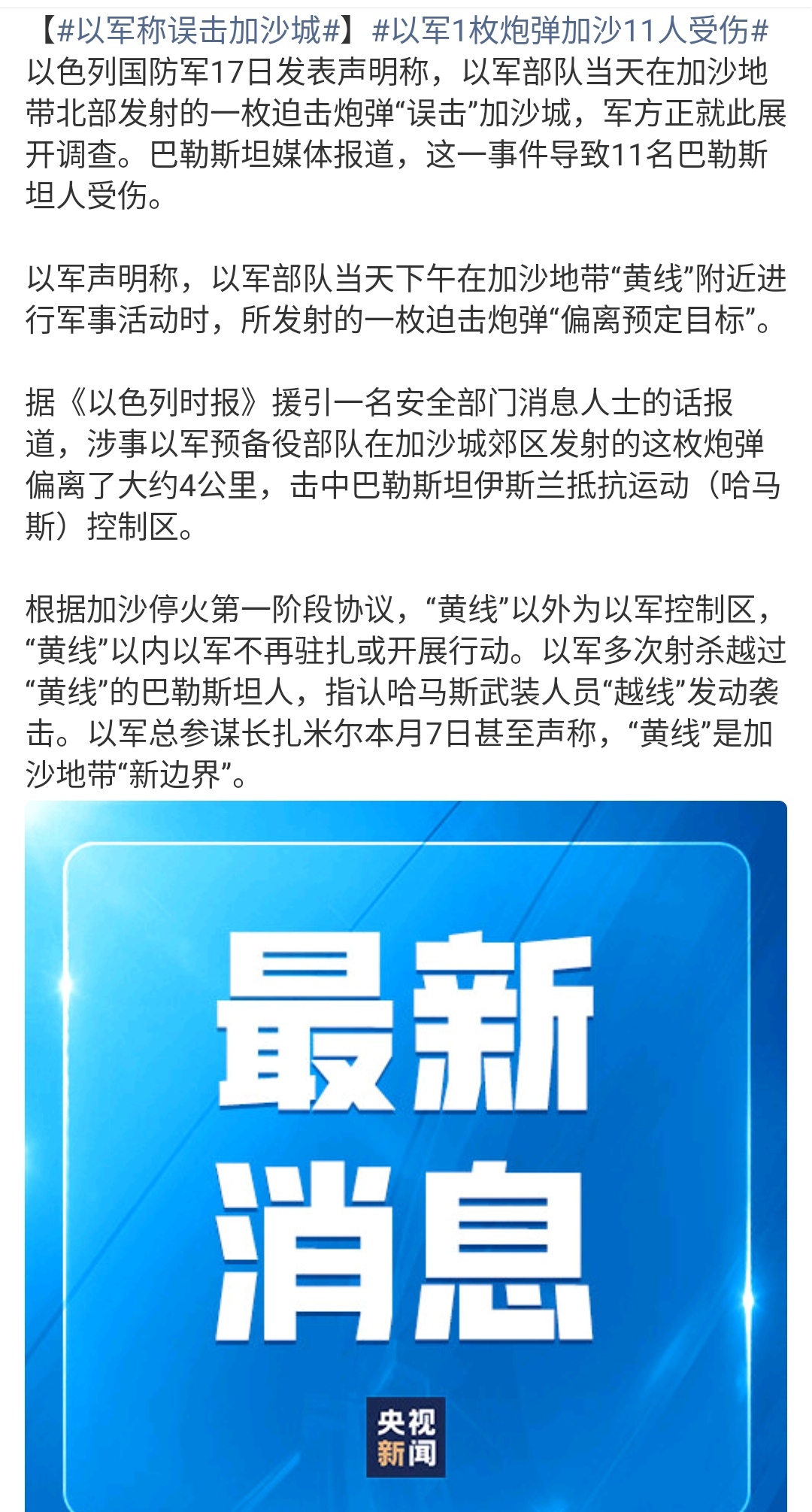 | 以色列国防军称在加沙地带北部发射的一枚迫击炮弹“误击”加沙城,致使11名巴勒斯坦人受伤,这一事件再次将巴以冲突的紧张局势推到公众视野。一枚迫击炮弹偏离预定目标达4公里,如此大的偏差绝非小失误。军事行动本应有着严格的规划、精准的操作以及有效的管控机制,以确保行动在预定范围内进行,避免对无关人员和区域造成伤害。此次“误击”反映出以军在迫击炮发射流程、目标定位、人员训练等方面可能存在不足,这种军事行动的不规范,不仅给巴勒斯坦平民带来了直接伤害,也严重损害了以军自身的形象和公信力。根据国际法,冲突各方有义务区分军事目标和平民目标,采取一切可行措施避免平民伤亡。加沙地带本就人口密集,平民众多,以军在军事行动中更应慎之又慎。然而此次“误击”导致11名平民受伤,这无疑是对国际法和人道主义精神的公然践踏。国际社会一直呼吁在冲突中保护平民生命安全,以军的这一行为无疑是对国际社会呼声的漠视。以军多次射杀越过“黄线”的巴勒斯坦人,并宣称“黄线”是加沙地带“新边界”,这种单方面的划界和强硬做法,不断激化着巴以之间的矛盾。此次“误击”事件发生后,巴勒斯坦方面必然会对以军产生更强烈的不满和抵触情绪,双方之间的信任进一步崩塌,和平谈判的难度也将进一步加大。以军此次“误击”加沙城事件,无论是从军事规范、国际法与人道主义,还是巴以冲突的大局势来看,都产生了严重的负面影响。国际社会应积极介入,推动巴以双方通过和平谈判解决争端,避免类似的悲剧再次上演,让加沙地带的人民能够早日摆脱冲突的阴霾,过上和平稳定的生活。
