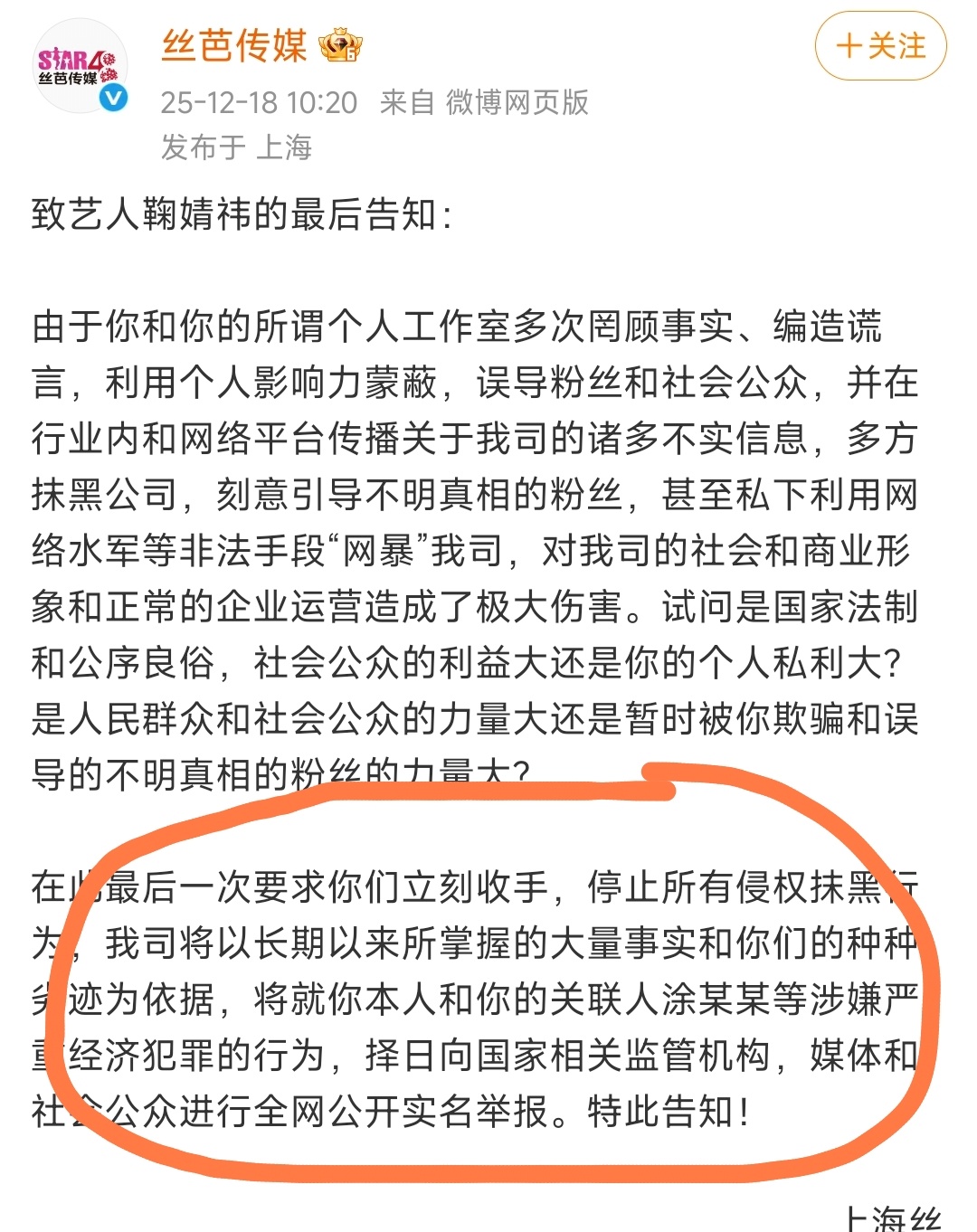 这是要往死里整啊,太难看了。丝芭传媒怼鞠婧祎的架势真厉害,直接发 “最后通牒” 放话:再拧巴就全网实名举报,还爆她和涂某某涉嫌经济犯罪。全网实明举报,这要成了的话,鞠婧祎是不是要坐牢了?一个合约拉扯闹到撕破脸,我都好奇这个合约能给公司赚多少钱,几个亿吗?说到底就是公司不想放摇钱树,艺人想单飞,可闹到举报犯罪的地步,属实是没留一点余地了别最后互相爆黑料,两边全玩完。
