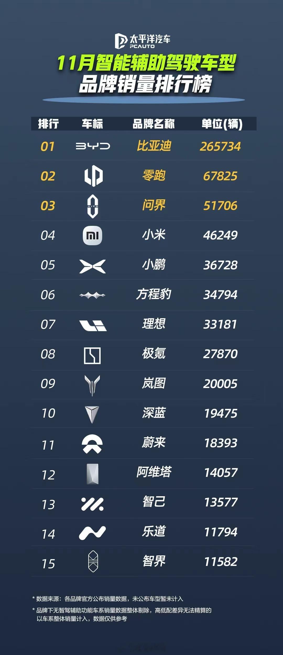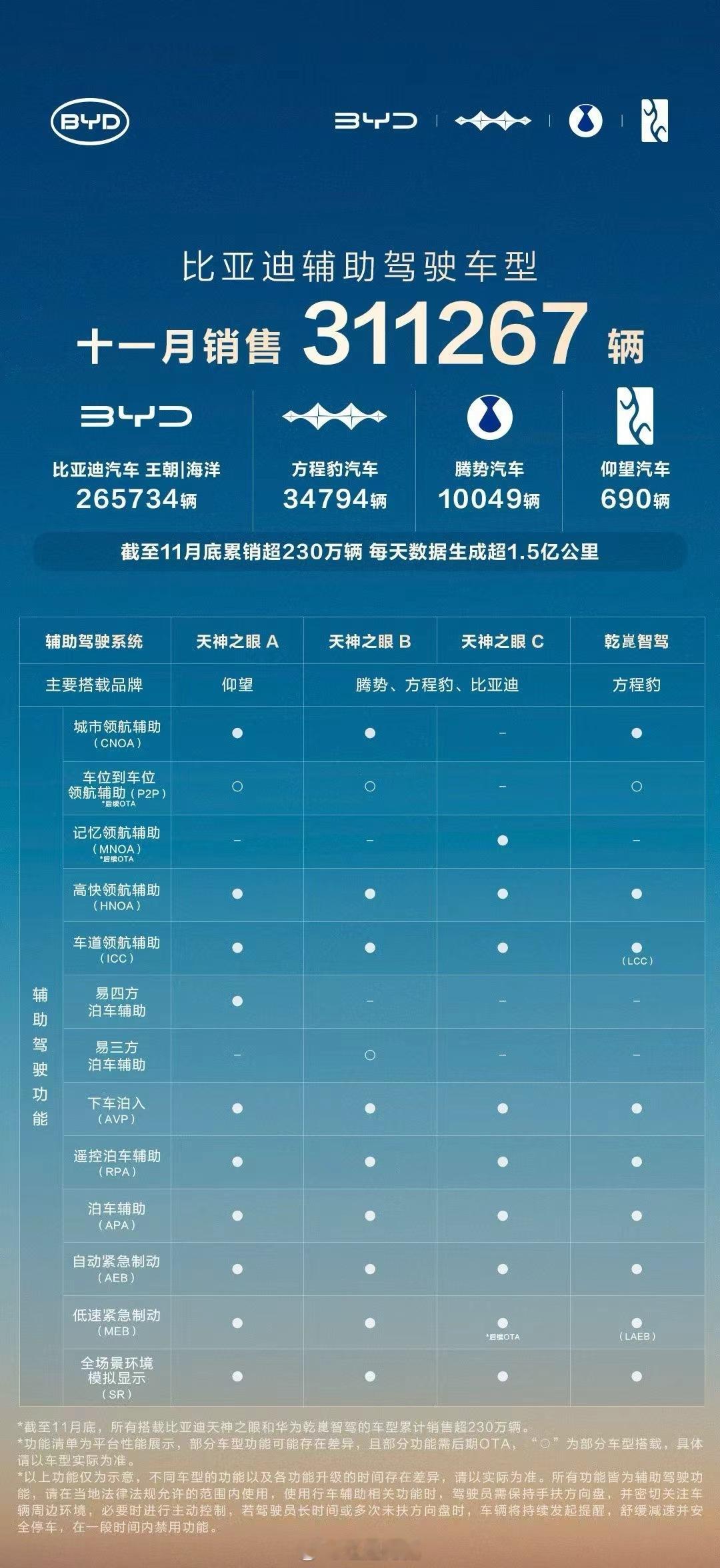 11月比亚迪搭载“天神之眼”辅助驾驶系统的车型单月销量达到311267辆其中王