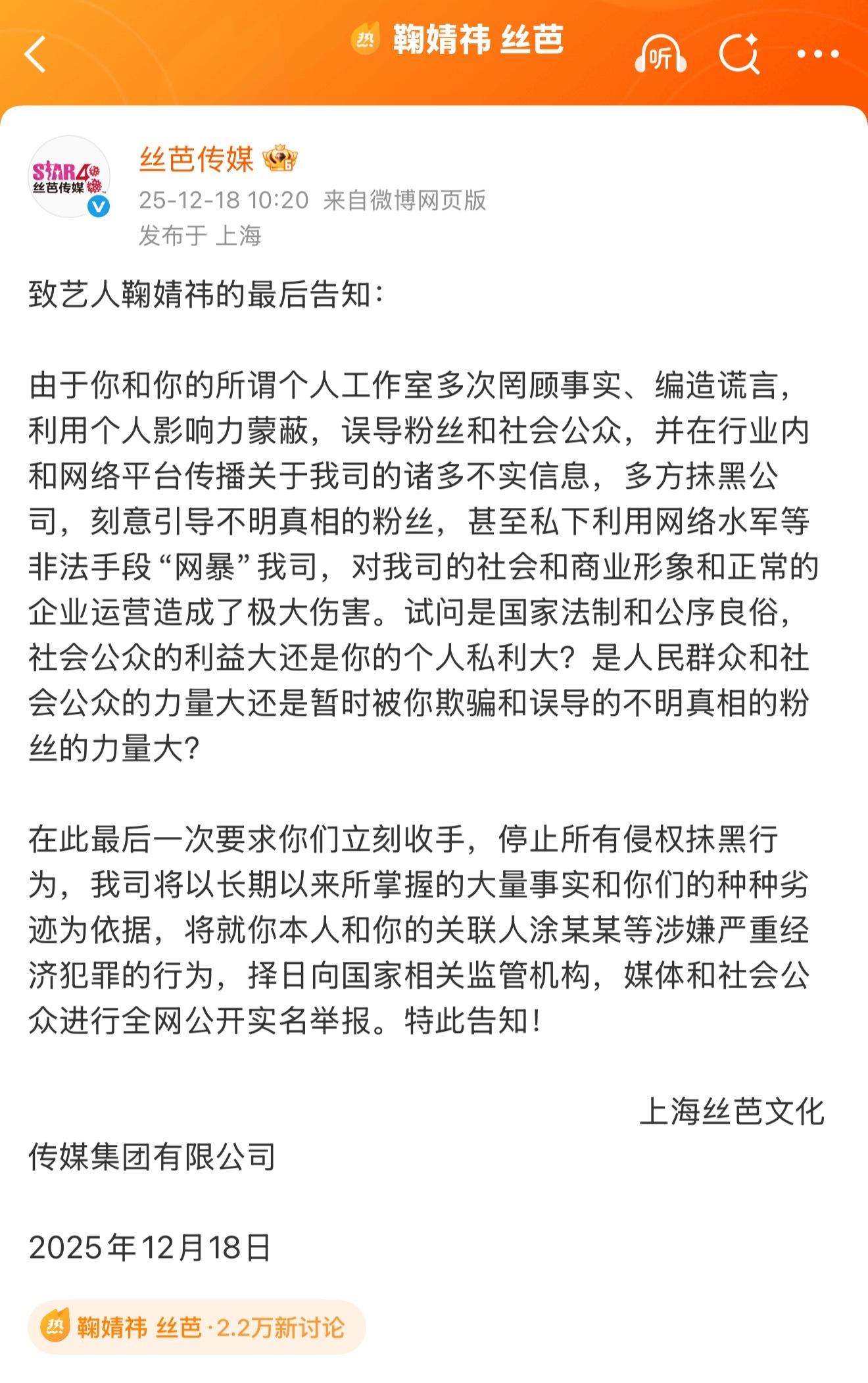 丝芭又发文了,说自己掌握了大量事实和种种劣迹,要向国家相关监管机构举报鞠婧祎和关
