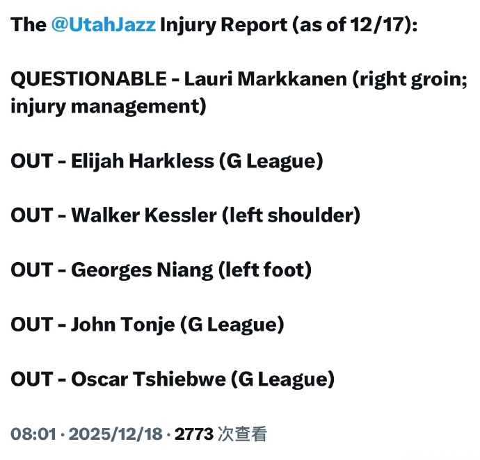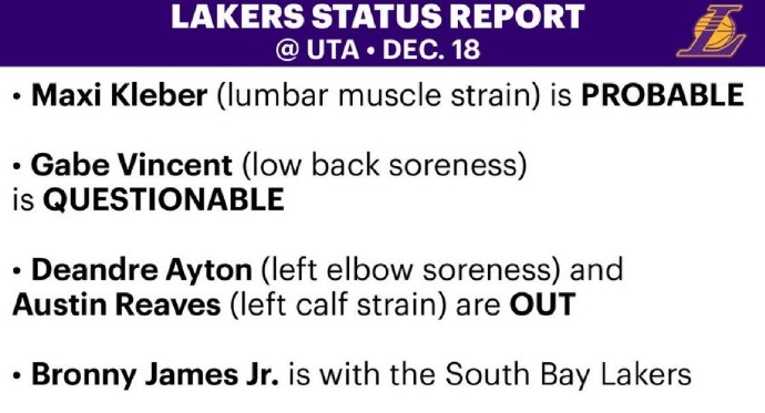 【比赛预告】明天10点,湖人客场对爵士,ESPN预测湖人胜率78.2%,【战绩排名】湖人18胜7负西部第3爵士10胜15负西部第10【近5场表现】湖人-胜负胜负胜爵士-胜负负胜胜11月19日,爵士126-140湖人11月24日,湖人108-106爵士【预测首发】湖人-东契奇,斯玛特,八村塁,詹姆斯,海斯爵士-乔治,米哈,贝利,马尔卡宁,努尔基奇【伤病情况】艾顿(左肘酸痛)里夫斯(左小腿拉伤)缺战。马尔卡宁(腹股沟)有伤出战成疑,凯斯勒、尼昂因伤缺阵。【攻防对比】湖人进攻效率第6,防守效率第20爵士进攻效率第22,防守效率第29