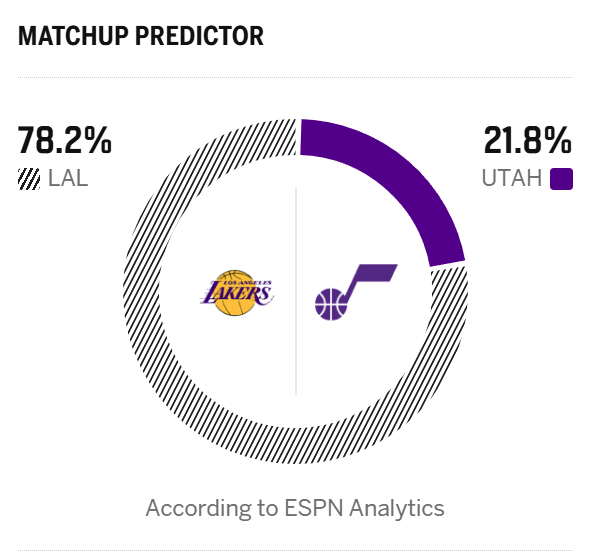 【比赛预告】明天10点,湖人客场对爵士,ESPN预测湖人胜率78.2%,【战绩排