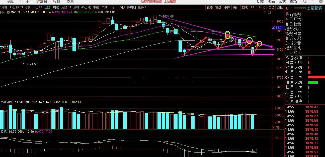 今日看盘上证指数 勿上头 本月的主线是航天,消费和cpo,其中2条线分化,底部板块出现大面积反弹,这就意味着本次行情,并不是反转,而是技术层面上的修复,资金做了高低切,300ETF、500ETF等成交量放大,当日沪深300ETF成交额就达到169亿,所以市场接近3900点。 从结构上来看,还没有突破下降通道的切线,这里还需要观察,况且本周的“黑天鹅”事件还没落地,技术上还差一口气,这里先暂缓一下,多看看态势。