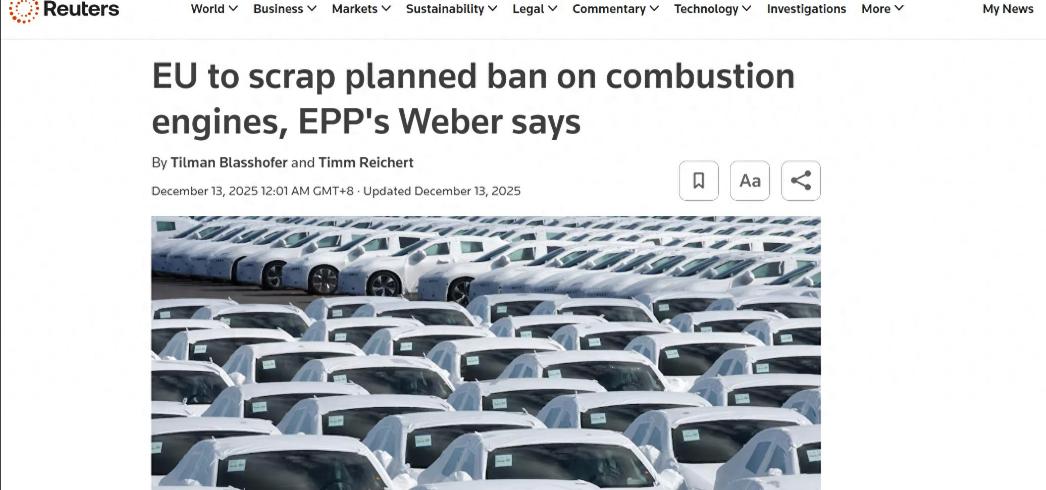 /竞争不过中国电车,欧盟摊牌了:既然难办,那就掀桌子大家别办了 12 月 16 日,欧盟官宣放弃原定于 2035 年全面实施的新车零排放命令,同时将原定目标改为减排 90%,原本被判了死刑的燃油车,重新拿到了可以继续销售的免死金牌。 放在几年前,欧盟喊出 2035 年禁售燃油车的时候,那股子坚决劲儿谁看了不说一句 “转型标兵”,当时不少人都觉得,欧洲要在新能源汽车领域一骑绝尘,把其他国家远远甩在身后。 可谁能想到,才过了没几年,风向说变就变,说好的零排放直接打了九折,剩下的 10% 缺口还能用低碳钢、电子燃料这些东西来凑数,相当于给燃油车、混动车型都开了绿灯,让它们能在 2035 年后接着在欧洲市场卖。 这波操作说白了,就是之前喊的口号太响,真到了要兑现的时候,发现自家的汽车产业根本扛不住,只能悄悄松口,给自己找个台阶下。 要说欧盟为啥突然 “认怂”,核心原因就俩字:没干过。 这些年中国电车在全球市场的表现,那真是肉眼可见的强势,尤其是在欧洲,直接把当地的传统车企逼得没了脾气。 早几年欧洲还想着用关税壁垒把中国电车挡在门外,可没想到中国车企压根不吃这一套,你加你的关税,我换我的策略,迅速加大了插混、增程这些车型的投放比例,纯电车占比虽然从 44% 降到了 34%,但整体销量反而蹭蹭涨,2025 年在欧洲的市场份额直接翻倍。 反观欧洲本土的汽车品牌,日子过得那叫一个艰难。大众、宝马这些曾经的行业巨头,在电动化转型上慢了半拍,推出的电动车要么价格居高不下,在德国,纯电车平均价格比同级别燃油车贵 20%,要么技术亮点不足,根本拼不过中国电车的高性价比和智能配置。 更要命的是,欧洲的充电基础设施也跟不上,高速公路上每 50 公里设置快充站的比例才 75%,好多消费者想买电动车都怕半路没电,再加上不少欧洲国家取消了新能源补贴,本土电动车销量直接下滑,2024 年 11 月欧盟纯电车销量同比下降 9.5%,德国和法国更是降了 20% 以上。 本土车企扛不住,背后的国家自然要出面撑腰。 其实欧盟心里也清楚,这波政策调整就是权宜之计,中国电车的优势已经不是靠关税或者改规则就能抵消的了,中国不仅有完整的新能源汽车产业链,电池技术、续航能力都在不断突破,而且价格还亲民,出口到欧洲后,就算加了关税,性价比依然能打。 反观欧洲车企,一方面要投入大量资金搞电动化转型,另一方面还要应对高能源成本和通胀压力,消费者购买力下降,新车销量一直没恢复到 2019 年的水平,法国、德国这些主要市场甚至还在下滑。 这就形成了一个很有意思的局面:欧盟本来想靠 2035 零排放的目标,既抢占新能源汽车的制高点,又能拦住中国电车的进攻,没想到偷鸡不成蚀把米,自家车企转型跟不上,中国电车反而趁势站稳了脚跟。 到最后没办法,只能把原来的硬目标改成软约束,给燃油车续命,相当于 “掀桌子” 告诉大家,之前的游戏规则不算数了,咱们换个玩法。 可这样的调整真能解决问题吗?恐怕很难。中国车企已经在欧洲市场扎下了根,不仅销量在涨,还在调整策略,通过合作代工、本地化生产等方式降低进入门槛,慢慢嵌入欧洲的产业环节。 而欧洲车企因为政策的不确定性,可能会推迟甚至搁置电动化的投资,反而会被中国车企拉开更大的差距。 说白了,欧盟这波操作,看似给本土车企争取了喘息的时间,实则是暴露了自己在新能源汽车竞争中的底气不足,与其说是调整策略,不如说是承认了自己竞争不过中国电车的现实。