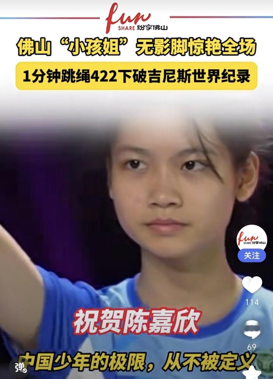 近日,佛山市顺德区勒流育贤实验学校的女生陈嘉欣火了。在跳绳比赛里,她1分钟跳绳422次,大幅超越1分钟单摇跳408次的吉尼斯世界纪录。 比赛时,她的绳子在空中划出虚影,双脚速度快到让人目不暇接。网友纷纷调侃,佛山无影脚果然名不虚传啊!太厉害了,这速度绳子都跟不上了,还以为在摇空气。虽然决赛她以408次的成绩与纪录持平,但预赛的“422”已足够证明实力。她不仅展现了出色的身体素质和协调能力,更体现了坚持不懈、勇于挑战的精神,是中国少年的骄傲!
