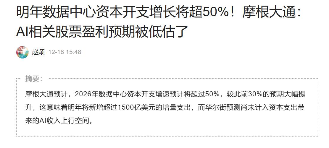 算力大跌后迎来了救命利好!摩根大通大幅上调明年AI资本支出增长幅度,港股尾盘科技出现抢筹拉升,明天A股大科技又稳了吗? 市场担忧AI资本开支下滑之际,摩根大通大幅上调数据中心资本开支增长预测,认为市场严重低估了AI相关股票的盈利潜力。 摩根大通北美股票研究团队在最新报告中表示,大型科技公司的军备竞赛不仅没有放缓,反而在加速。根据报告,2026年数据中心资本开支增速预计将超过50%,较此前30%的预期大幅提升。这意味着明年将新增超过1500亿美元的增量支出,基本覆盖英伟达、AMD、博通和Marvell等核心AI芯片厂商的预期营收。 摩根大通的这个报告,应该是能一定程度减轻市场对于AI泡沫的担忧! 所以摩根的这个报告,可以看作是AI大科技的一个救命利好。 现在美股已经是严重被AI捆绑。如果AI真的陷入泡沫隐忧,陷入衰退,那美股不得崩? 美国老百姓大部分财富都是在美股上,都已经超越了地产了。所以美股对于美国而言是一荣俱荣,一损俱损的事情。 所以机构会让美股跌吗? 现在市场开始出现对AI泡沫担忧之际,机构们就开始唱多了。 现在港股尾盘开始出现抢筹拉升现象,说明资金开始提前布局了。 所以明天A股大科技有望回暖!