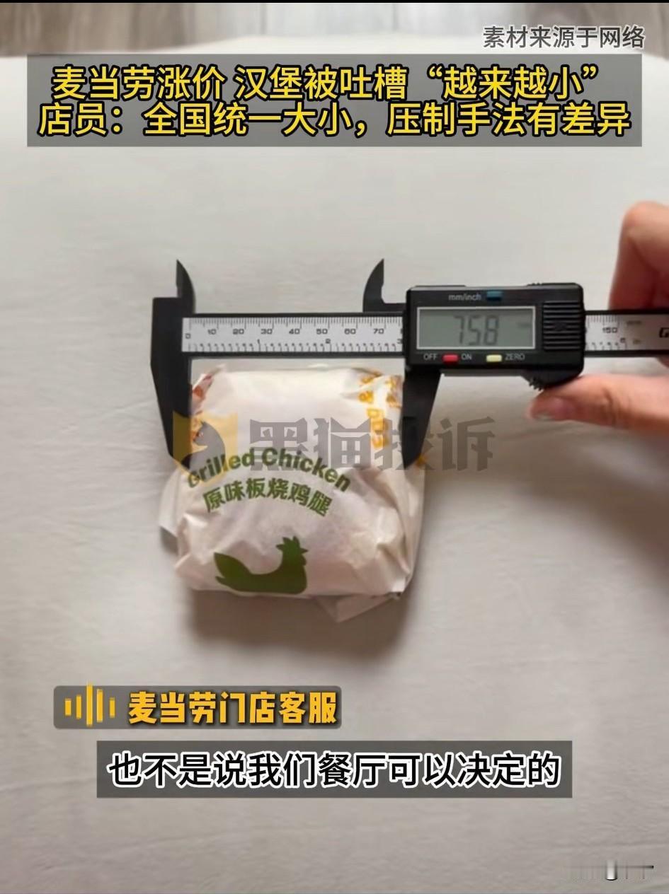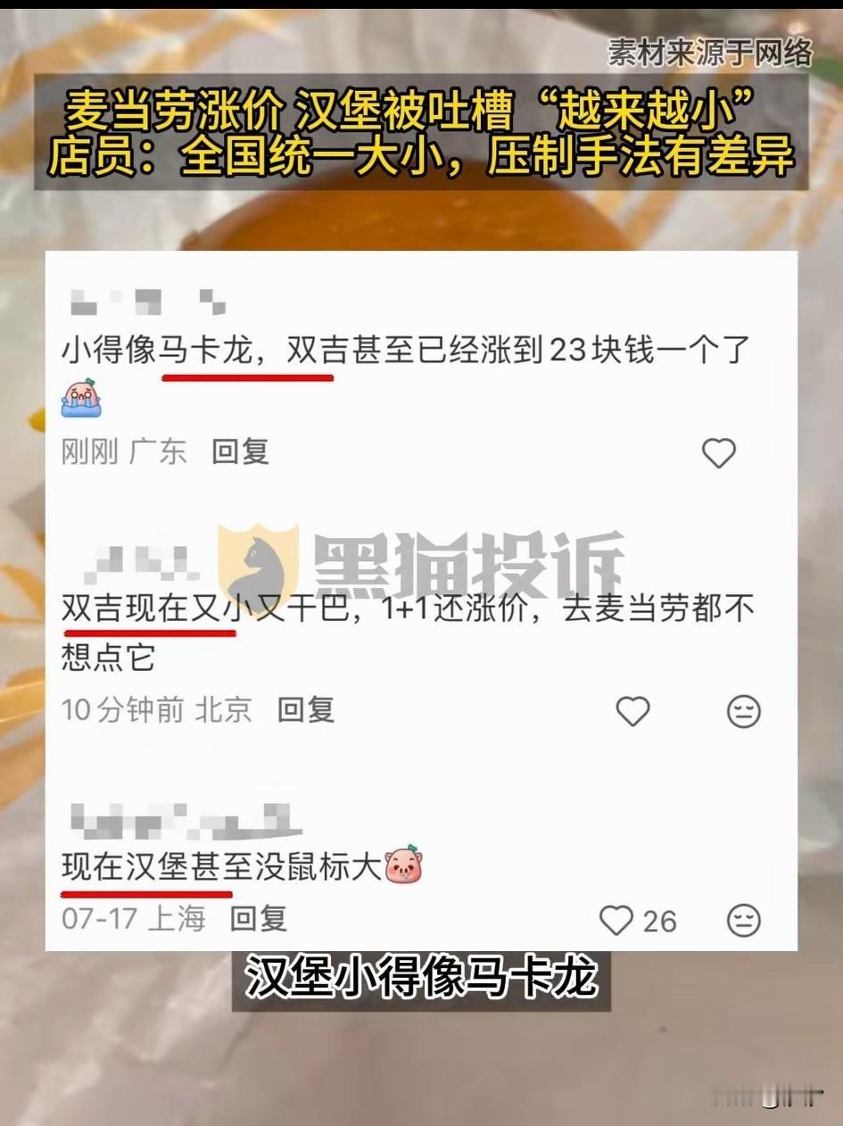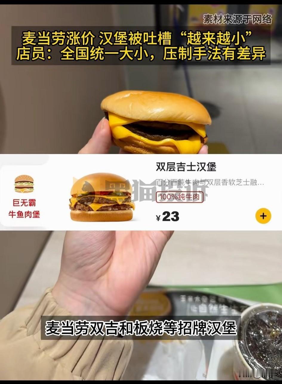 麦当劳涨价了, 它的汉堡被吐槽越来越小, 很多网友反馈给了黑猫投诉, 一个23元