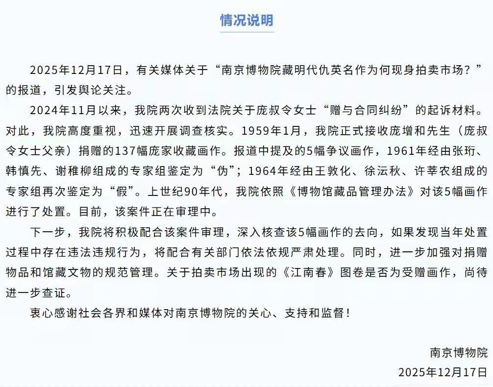 江苏文旅厅已经介入调查。 南京博物院的一件流传有序的重磅藏品,突然出现在了拍卖会