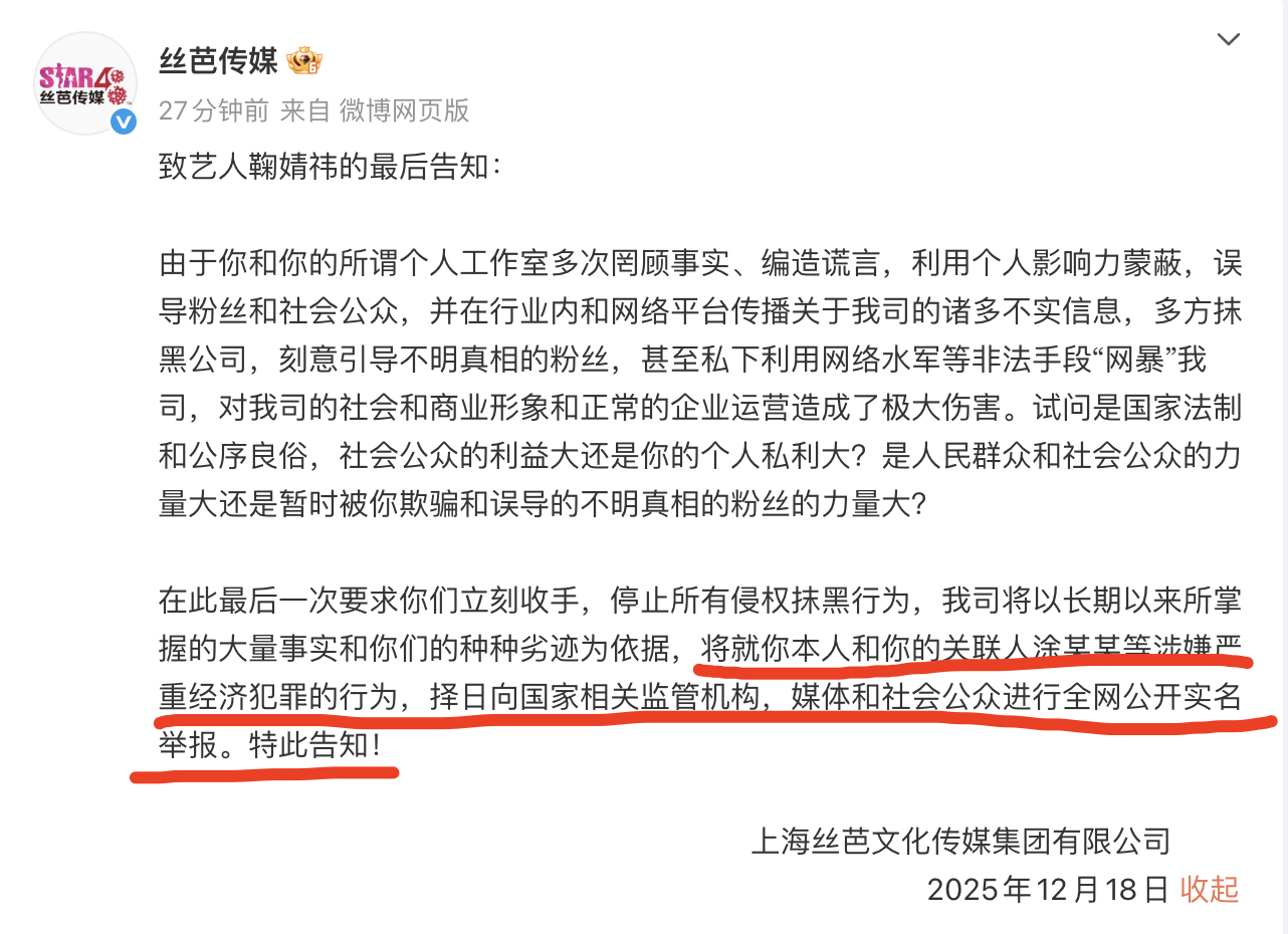 丝芭开始跟鞠婧祎拼刺刀了,不过我说句实话,这种经济犯罪如果有的话,大概率是和经纪公司一起犯下的,想当于杀敌八百自损一千,你们觉得鞠婧祎该认输,交个违约金收场吗? 丝芭喊话鞠婧祎再不收手将实名举报 丝芭指控鞠婧祎严重经济犯罪 丝芭曾起诉鞠婧祎代言品牌 郭敬明王一栩 苦命鸳鸯