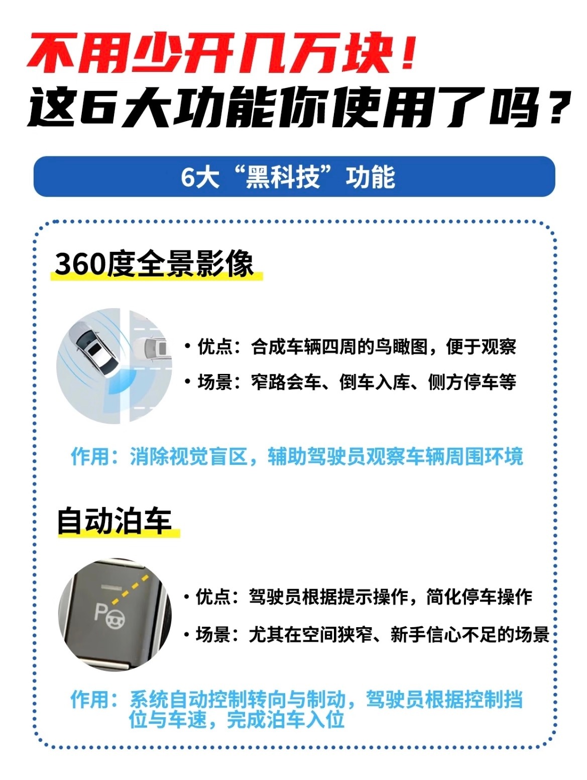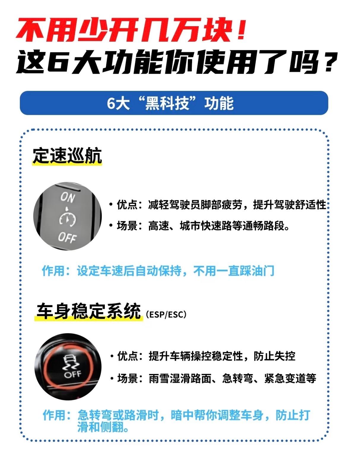 🚗 六大实用汽车功能|你用上它们了吗?!🅿️ 泊车辅助系统1️⃣ 360度全景影像 🎥· 核心作用:消除视觉盲区,提供上帝视角。· 主要优势:直观显示车辆周边环境。· 适用场景:窄路会车、复杂车位泊车。2️⃣ 自动泊车 🤖· 核心作用:辅助驾驶员,简化泊车操作。· 主要优势:系统自动操控方向盘,降低停车难度。· 适用场景:狭窄空间、新手驾驶员泊车。🛣️ 驾驶辅助系统3️⃣ 定速巡航 ⚙️· 核心作用:按设定速度自动维持行驶。· 主要优势:有效缓解长途驾驶的脚部疲劳。· 适用场景:高速公路、路况良好的城市快速路。4️⃣ 车身稳定系统 (ESP/ESC) 🛡️· 核心作用:实时监控并主动纠正车辆失控趋势。· 主要优势:极大提升湿滑路面与紧急避让时的稳定性。· 适用场景:雨雪天气、急转弯、紧急变道。⛽ 节能与舒适系统5️⃣ 自动启停 🔄· 核心作用:在临时停车时自动关闭/重启发动机。· 主要优势:减少怠速油耗与排放。· 适用场景:城市拥堵路段、等待时间较长的红绿灯。6️⃣ 自动驻车 (AUTO HOLD) 🛑· 核心作用:车辆停稳后,自动保持驻车状态。· 主要优势:解放右脚,防止坡道溜车。· 适用场景:红绿灯排队、坡道起步、长时间拥堵。我与汽车的日常大v聊车