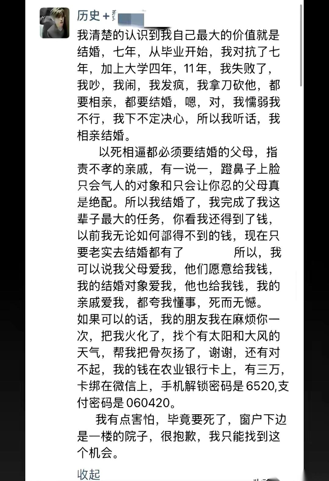红色的喜字可能还没撕掉,28岁的新娘,就从楼上跳下去了。 一个当老师的姑娘,人生最好最好的年纪。 穿上婚纱的那一天,她选择穿上了死亡。 很多人第一时间就说,哦,抑郁症啊,那没办法了。 好像只要贴上这个标签,一切就顺理成章,大家就可以心安理得地散去,顺便感慨一句“世事无常”。 可我想问,是什么,把一个活生生的、教书育人的人,逼到了这一步? 婚礼那天,应该是全世界最幸福的时刻吧? 可对她来说,那或许不是幸福的开场,而是压垮她的最后一根稻草,是她人生无法再拖延的deadline。 别跟我说什么“父母都是为你好”,也别扯什么“不结婚人类就要灭绝了”。 宏大的道理,救不了一个具体的人。 爱是真的,想让女儿过上“正常人”的生活,也是真的。 但那种密不透风的、以“为你好”为名的控制,那种“到年龄了就该结婚”的催促,那种把你的人生当成一个必须完成的KPI来考核的爱…… 有时候,真的能杀人。 他们给了她全世界的“应该”,却唯独没问过她一句“你愿不愿意”。 她可能挣扎过,可能求救过,但声音太小,小到所有人都觉得是“矫情”“不懂事”。 于是她不说了。 她用最决绝的方式,让全世界都听到了她的“不愿意”。 我们身边,有多少这样“听话”的好孩子? 他们不哭不闹,循规蹈矩,只是在某个别人看不见的深夜,悄悄地给自己判了死刑。 那件洁白的婚纱,本该是她奔赴新生活的战袍。 最后,却成了她的裹尸布。 一声叹息。