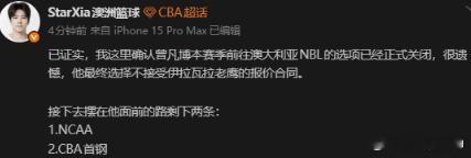 澳媒:曾凡博不接受伊拉瓦拉老鹰报价,前往澳篮的选项已关闭12月18日讯 今日,据澳篮媒体人:曾凡博不接受伊拉瓦拉老鹰报价,前往澳篮的选项已关闭。具体内容如下:“已证实,我这里确认曾凡博本赛季前往澳大利亚NBL的选项已经正式关闭,很遗憾,他最终选择不接受伊拉瓦拉老鹰的报价合同。接下去摆在他面前的路剩下两条:1.NCAA;2.CBA首钢。”