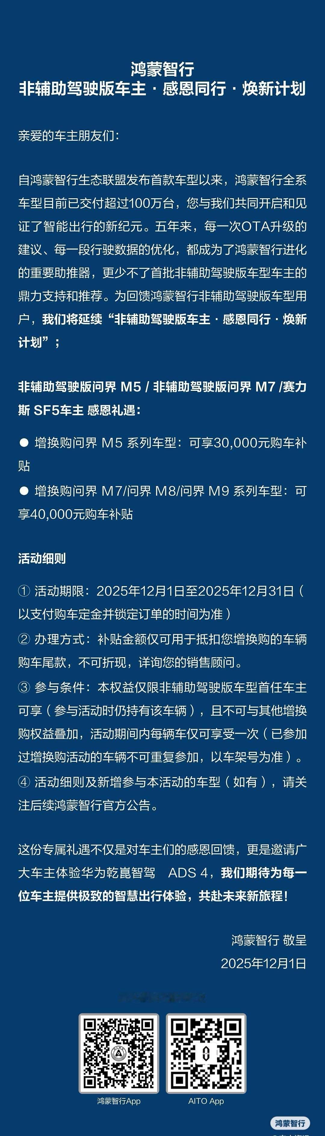 划重点:非辅助驾驶版本的问界车主换车补贴最高4W活动期限:12月31日前