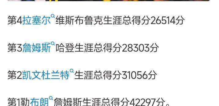 现役NBA四大得分手。 詹姆斯4.2万分。 杜兰特3.1万分。 哈登2.8万分。 威少2.6万分。 库里由于新秀期缺阵很多场,暂时追不上他们四个,最多将来超威少。[思考]