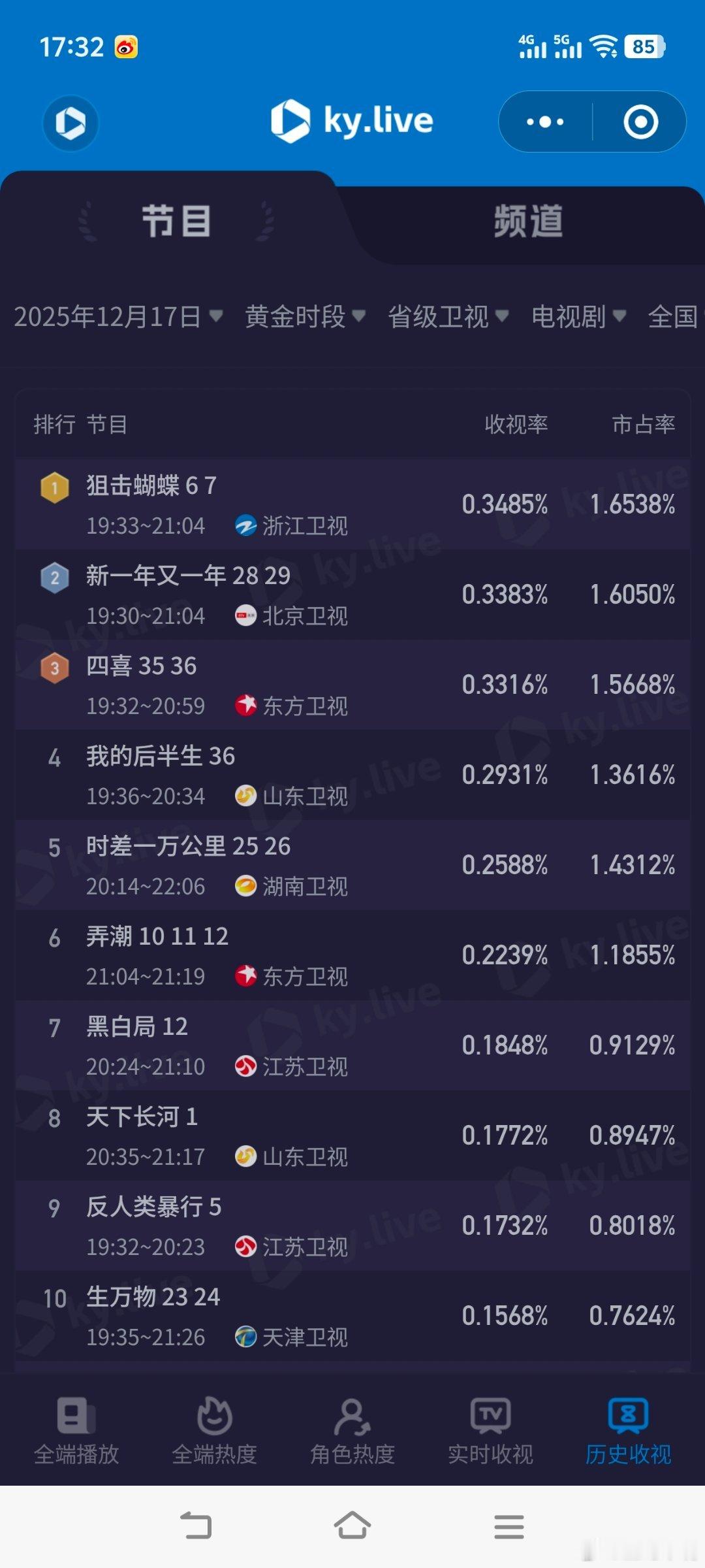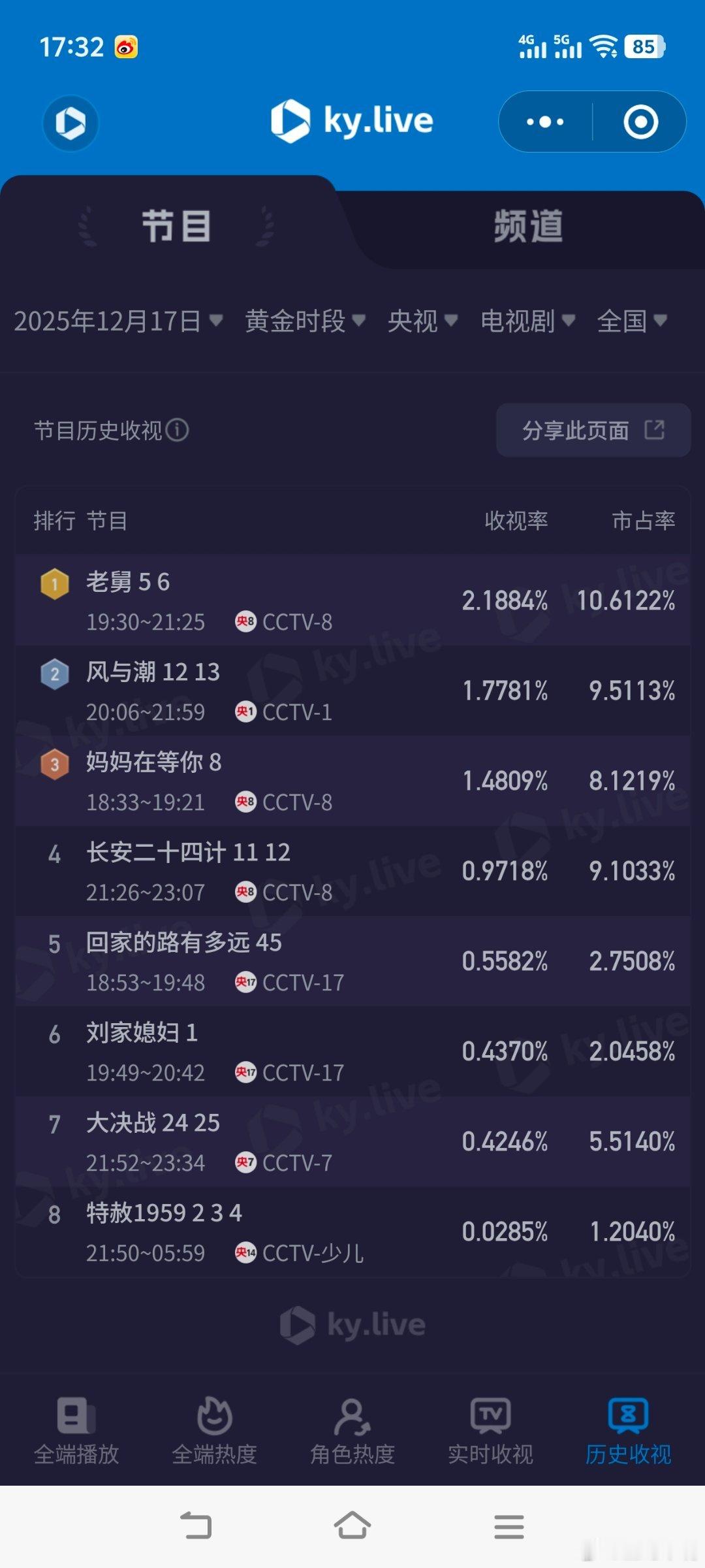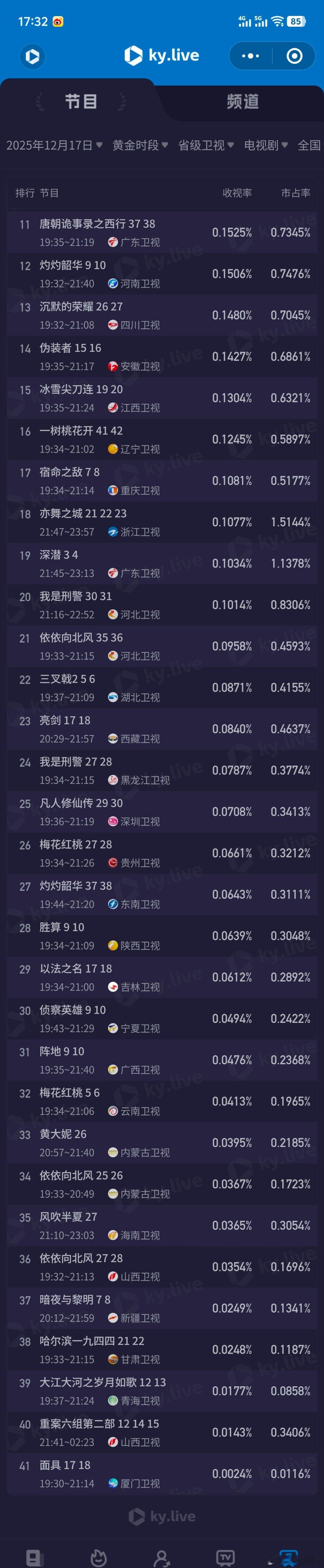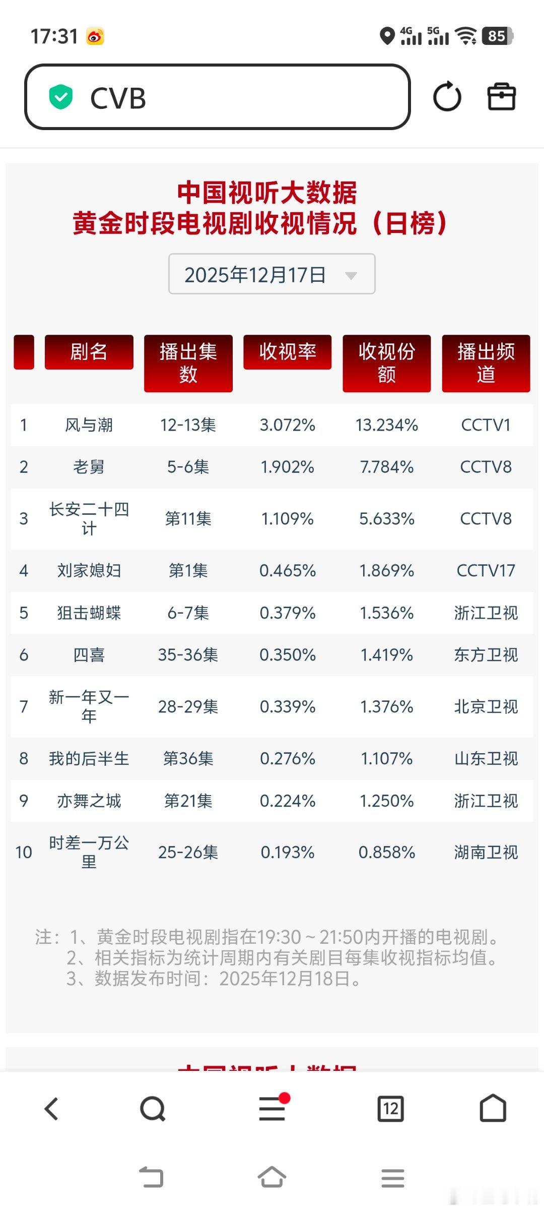 老舅12月17日cvb收视日报风与潮 3.072,酷云1.7781,系数1.728老舅 1.902,酷云2.1884,系数0.869狙击蝴蝶0.379,酷云0.3485,系数1.087四喜 0.350,酷云0.3316,系数1.055新一年又一年0.339,酷云0.3383,系数1.002时差一万公里0.193,酷云0.2588,系数0.746