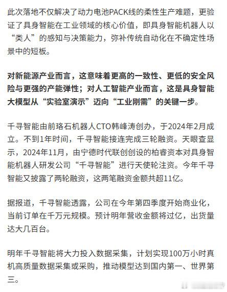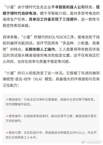 人形机器人批量上岗宁德时代12月18日,财联社APP报道,全球首条实现人形具身智能机器人规模化落地的新能源动力电池PACK生产线,在宁德时代中州基地正式投入运行。人形机器人“小墨”已能精准完成电池接插件插接等复杂作业,标志着具身智能在智能制造领域投入应用。“小墨”由宁德时代生态企业千寻智能机器人公司研发,搭载宁德时代自研电池。据千寻智能介绍,面对多型号电池的连续生产任务,其单日工作量实现了三倍提升,且一致性与稳定性表现卓越。人形机器人宁德时代动力电池