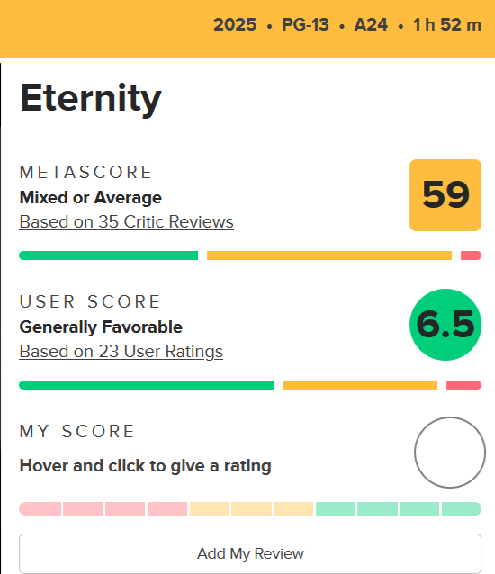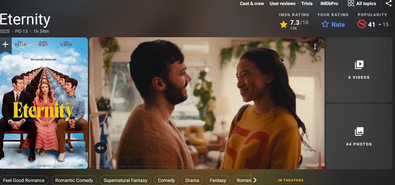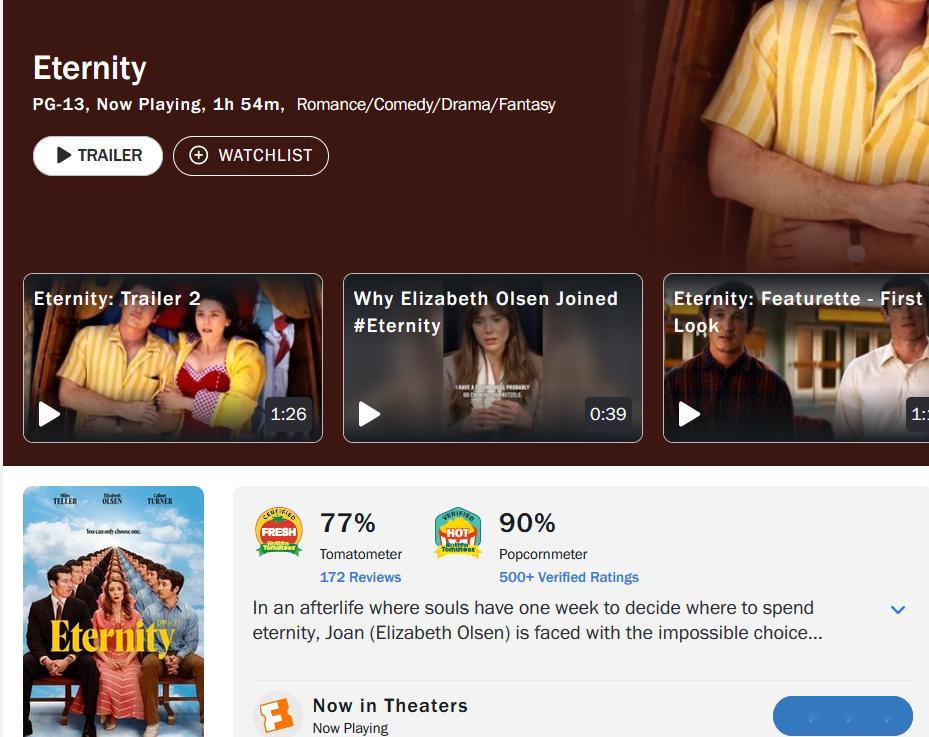 A24新出的奇幻爱情喜剧《永恒站》定档,12月24日全国上映。大卫·费恩导演,伊丽莎白·奥尔森、迈尔斯·特勒、克勒姆·特纳主演,世界观设定是:人离世后会进入一个连接无数“永恒世界”的中转站,作出选择后就无法改变。而死去的女主需要在67年前阵亡的挚爱前夫与相濡以沫一辈子的现任之间作出抉择。听上去比较老套,但豆瓣评分7.2(800人看过)、imdb评分7.3,烂番茄新鲜度77%,也不算低,只有Metascore不太高(59分)。电影永恒站定档永恒站