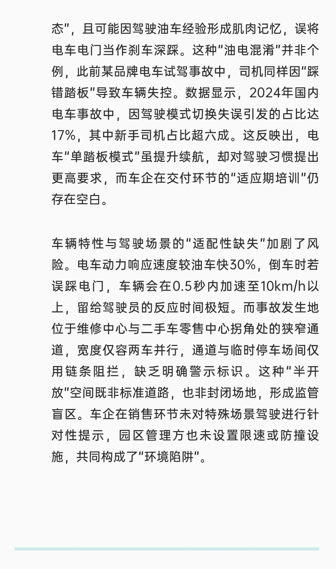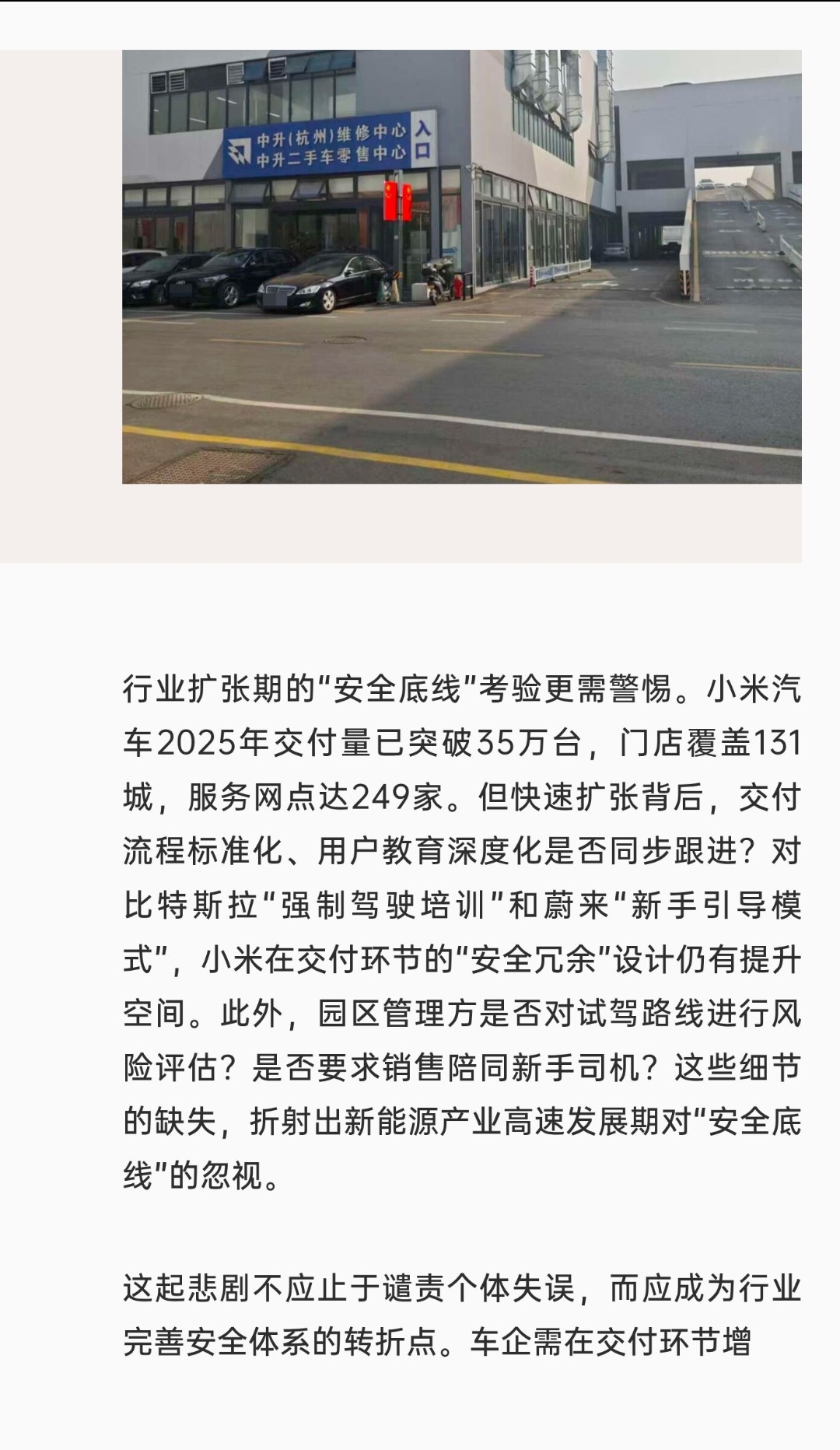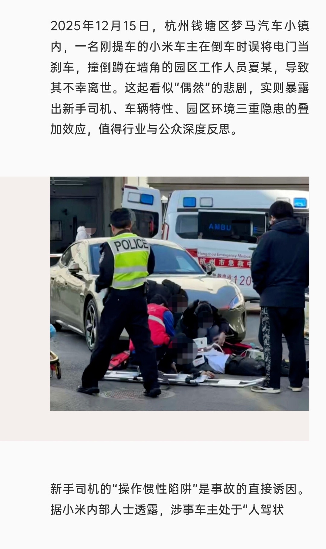 | 2025年12月15日,杭州钱塘区梦马汽车小镇内,一名刚提车的小米车主在倒车时误将电门当刹车,撞倒蹲在墙角的园区工作人员夏某,导致其不幸离世。据小米内部人士透露,涉事车主处于“人驾状态”,且可能因驾驶油车经验形成肌肉记忆,误将电车电门当作刹车深踩。这种“油电混淆”并非个例,此前某品牌电车试驾事故中,司机同样因“踩错踏板”导致车辆失控。数据显示,2024年国内电车事故中,因驾驶模式切换失误引发的占比达17%,其中新手司机占比超六成。这反映出,电车“单踏板模式”虽提升续航,却对驾驶习惯提出更高要求,而车企在交付环节的“适应期培训”仍存在空白。电车动力响应速度较油车快30%,倒车时若误踩电门,车辆会在0.5秒内加速至10km/h以上,留给驾驶员的反应时间极短。而事故发生地位于维修中心与二手车零售中心拐角处的狭窄通道,宽度仅容两车并行,通道与临时停车场间仅用链条阻拦,缺乏明确警示标识。这种“半开放”空间既非标准道路,也非封闭场地,形成监管盲区。车企在销售环节未对特殊场景驾驶进行针对性提示,园区管理方也未设置限速或防撞设施,共同构成了“环境陷阱”。小米汽车2025年交付量已突破35万台,门店覆盖131城,服务网点达249家。但快速扩张背后,交付流程标准化、用户教育深度化是否同步跟进?对比特斯拉“强制驾驶培训”和蔚来“新手引导模式”,小米在交付环节的“安全冗余”设计仍有提升空间。此外,园区管理方是否对试驾路线进行风险评估?是否要求销售陪同新手司机?这些细节的缺失,折射出新能源产业高速发展期对“安全底线”的忽视。这起悲剧不应止于谴责个体失误,而应成为行业完善安全体系的转折点。车企需在交付环节增加“油电切换模拟训练”,园区应划定专属试驾区并设置电子围栏,监管部门也需出台“新能源车辆特殊场景驾驶规范”。唯有将安全意识嵌入产业发展的每个环节,才能避免“技术进步”成为“生命代价”的推手。