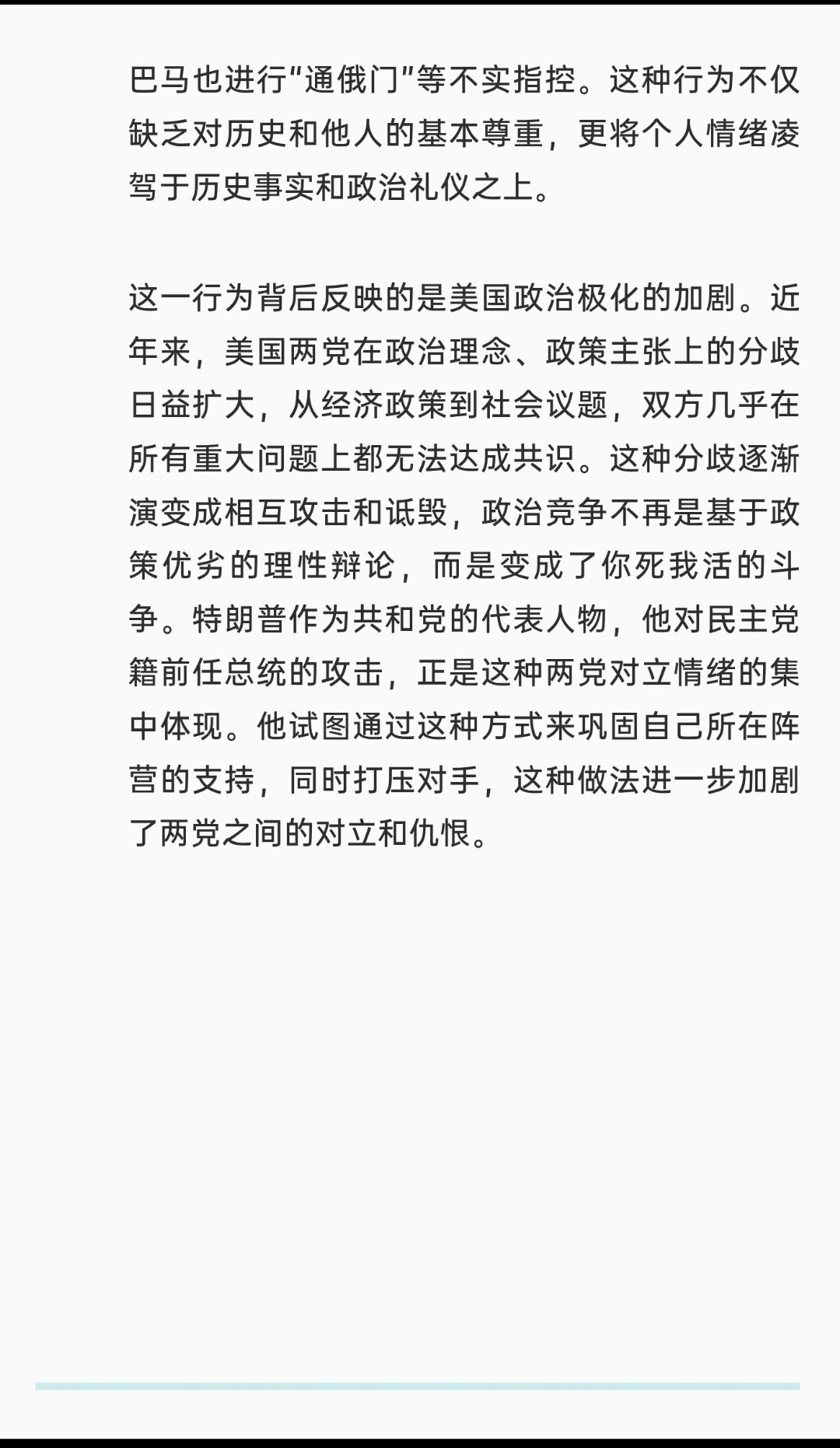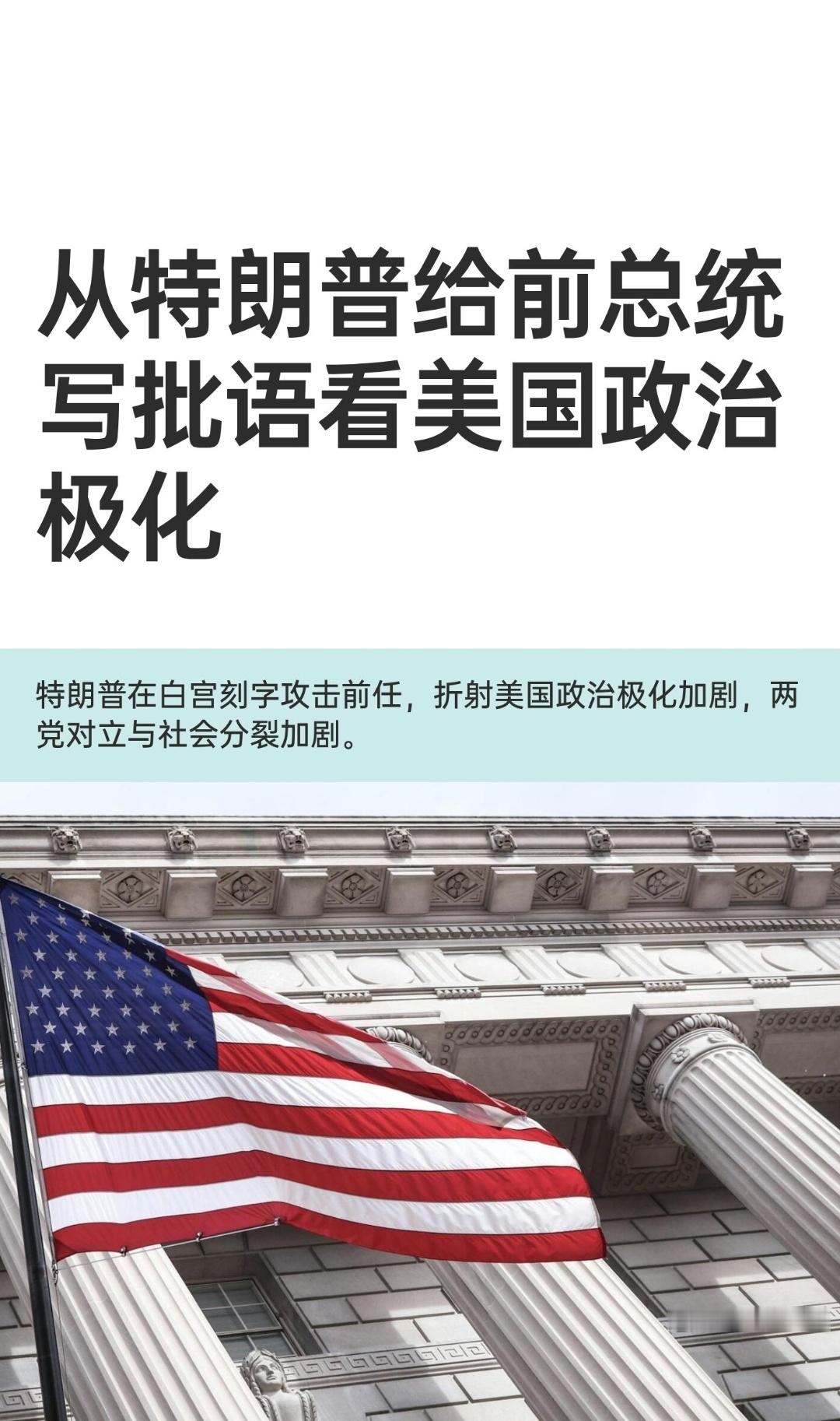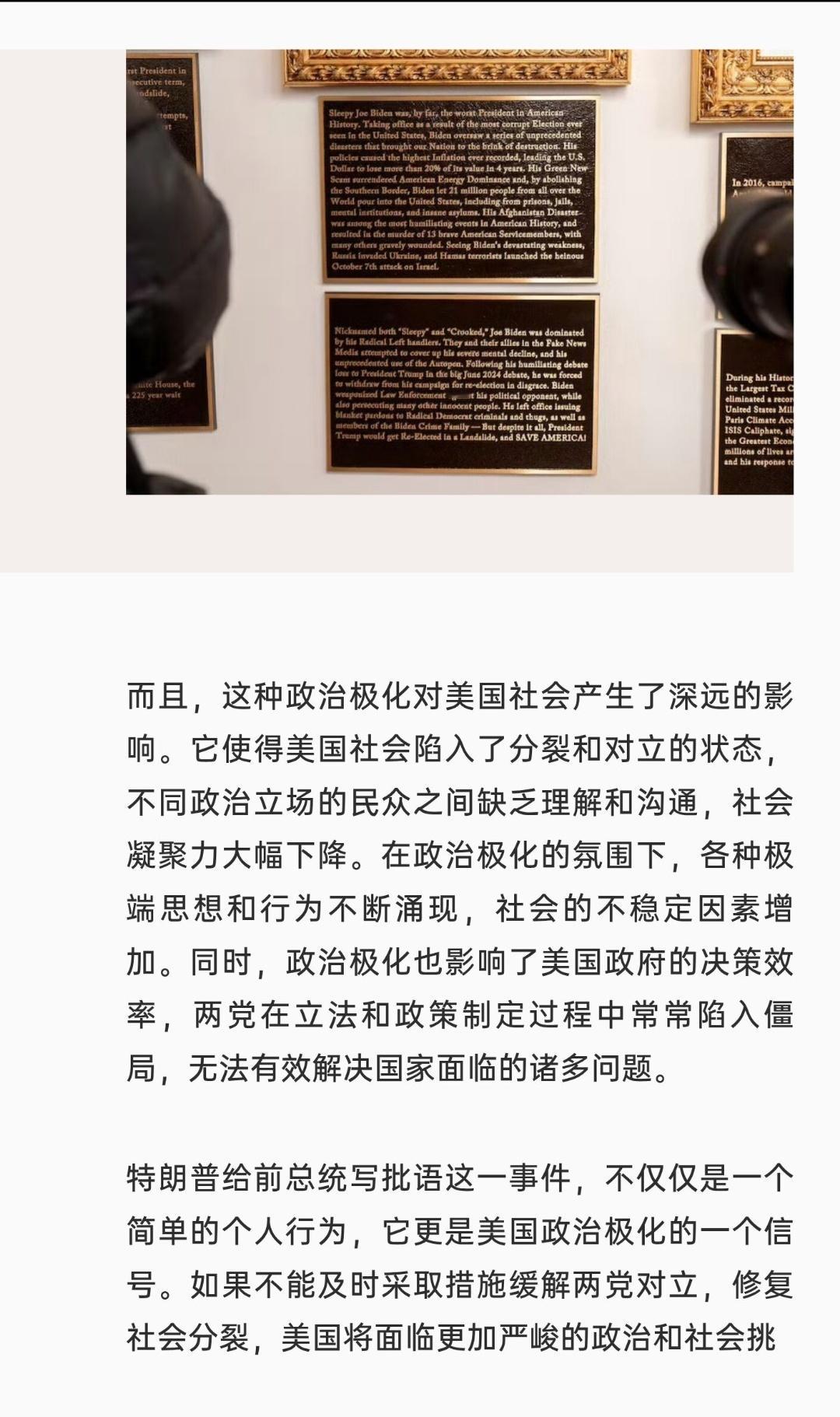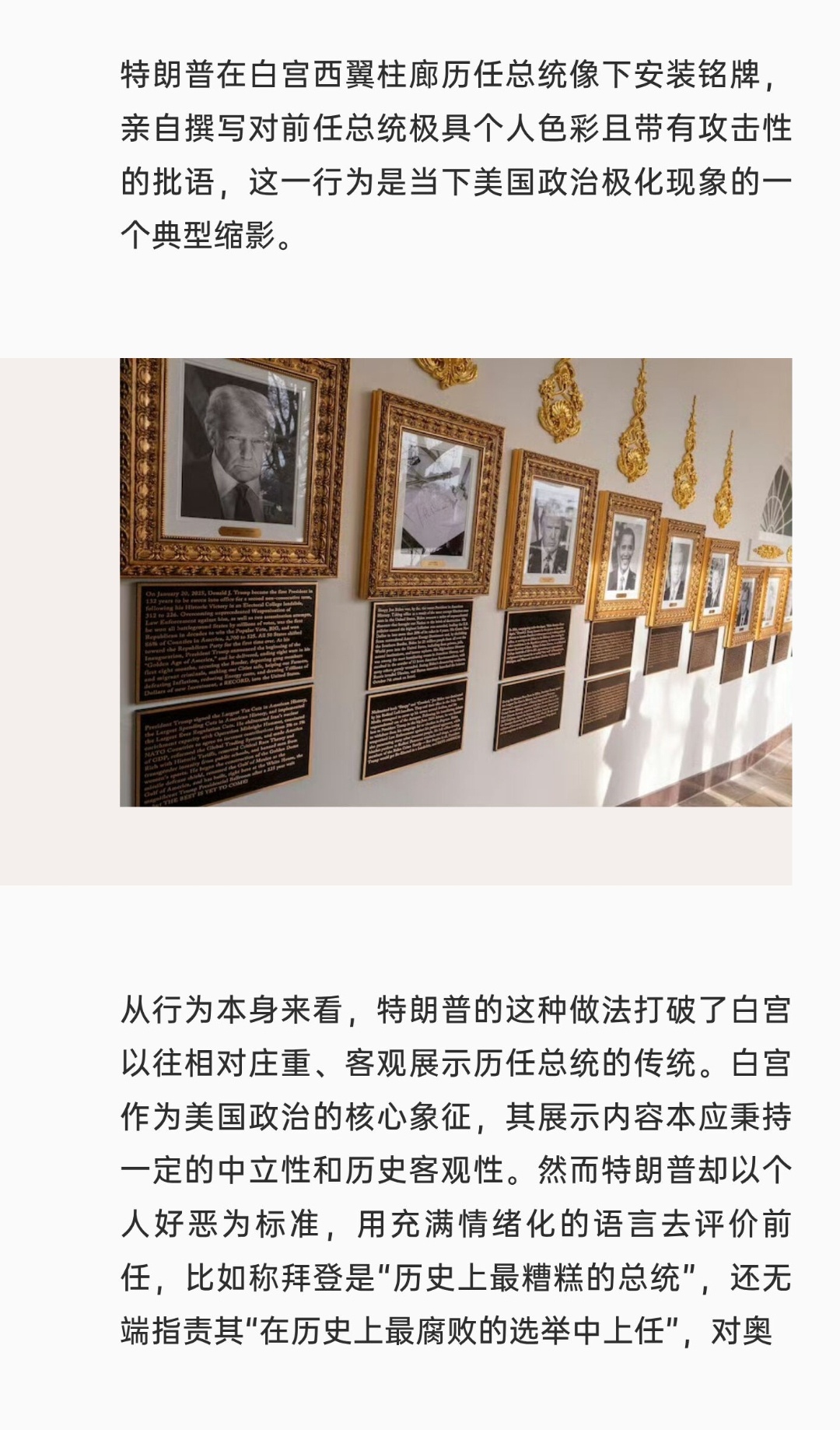 | 特朗普在白宫西翼柱廊历任总统像下安装铭牌,亲自撰写对前任总统极具个人色彩且带有攻击性的批语。特朗普的这种做法打破了白宫以往相对庄重、客观展示历任总统的传统。白宫作为美国政治的核心象征,其展示内容本应秉持一定的中立性和历史客观性。然而特朗普却以个人好恶为标准,用充满情绪化的语言去评价前任,比如称拜登是“历史上最糟糕的总统”,还无端指责其“在历史上最腐败的选举中上任”,对奥巴马也进行“通俄门”等不实指控。这种行为不仅缺乏对历史和他人的基本尊重,更将个人情绪凌驾于历史事实和政治礼仪之上。近年来,美国两党在政治理念、政策主张上的分歧日益扩大,从经济政策到社会议题,双方几乎在所有重大问题上都无法达成共识。这种分歧逐渐演变成相互攻击和诋毁,政治竞争不再是基于政策优劣的理性辩论,而是变成了你死我活的斗争。特朗普作为共和党的代表人物,他对民主党籍前任总统的攻击,正是这种两党对立情绪的集中体现。他试图通过这种方式来巩固自己所在阵营的支持,同时打压对手,这种做法进一步加剧了两党之间的对立和仇恨。而且,这种政治极化对美国社会产生了深远的影响。它使得美国社会陷入了分裂和对立的状态,不同政治立场的民众之间缺乏理解和沟通,社会凝聚力大幅下降。在政治极化的氛围下,各种极端思想和行为不断涌现,社会的不稳定因素增加。同时,政治极化也影响了美国政府的决策效率,两党在立法和政策制定过程中常常陷入僵局,无法有效解决国家面临的诸多问题。特朗普给前总统写批语这一事件,不仅仅是一个简单的个人行为,它更是美国政治极化的一个信号。如果不能及时采取措施缓解两党对立,修复社会分裂,美国将面临更加严峻的政治和社会挑战,其民主制度的根基也可能受到进一步的动摇。