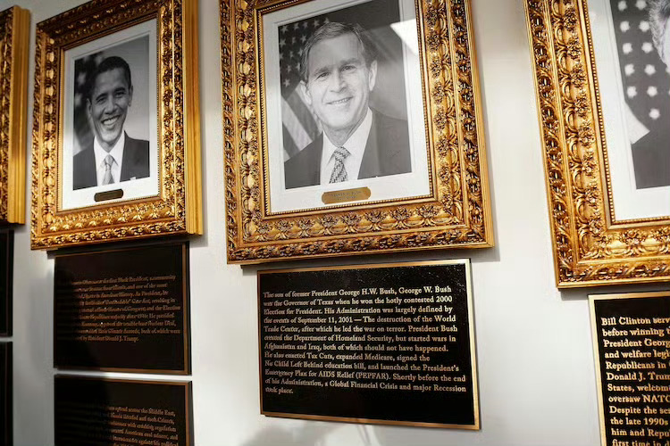 |特朗普在白宫西翼柱廊历任总统像下安装铭牌,亲自撰写对前任总统极具个人色彩且带