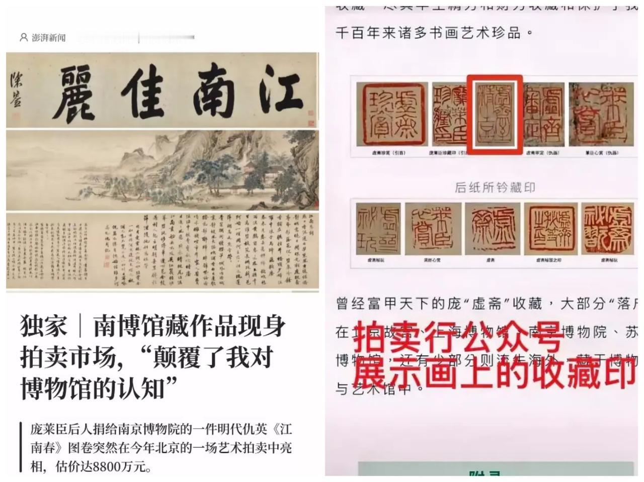 我有预感,“南京博物馆的藏品出现在拍卖行”这种现象未来会不断冒出来。 一幅突然出现在拍卖行,估价8800万元的明代仇英《江南春》图卷引发收藏界地震;这幅图卷原为中国近现代收藏大家庞莱臣后人捐给南京博物院的藏品。 据相关报道,流出原因是该幅图卷“被几位专家鉴定为赝品”处理出了博物馆。 搞笑吧。嚣张吧。 一点也不好笑。 也一点不嚣张。 “将真品鉴定为赝品往外卖”只是其中一种手段罢了。 每个博物馆里几乎都是几十万件甚至上百万件的藏品,这么多年的储藏、修复、研究和管理过程中必然会出现不少的漏洞和出现不少坏人。 有多少珍品被调包流向市场谁都不知道。 但可以肯定的是。 前一两个收藏者知道来路不正。 只敢在私底下流动。 甚至不敢回流国内。 但转手的次数多了。 很多收藏者自己都不知道这些作品的来路了。 陆续出现在拍卖会就不意外了。