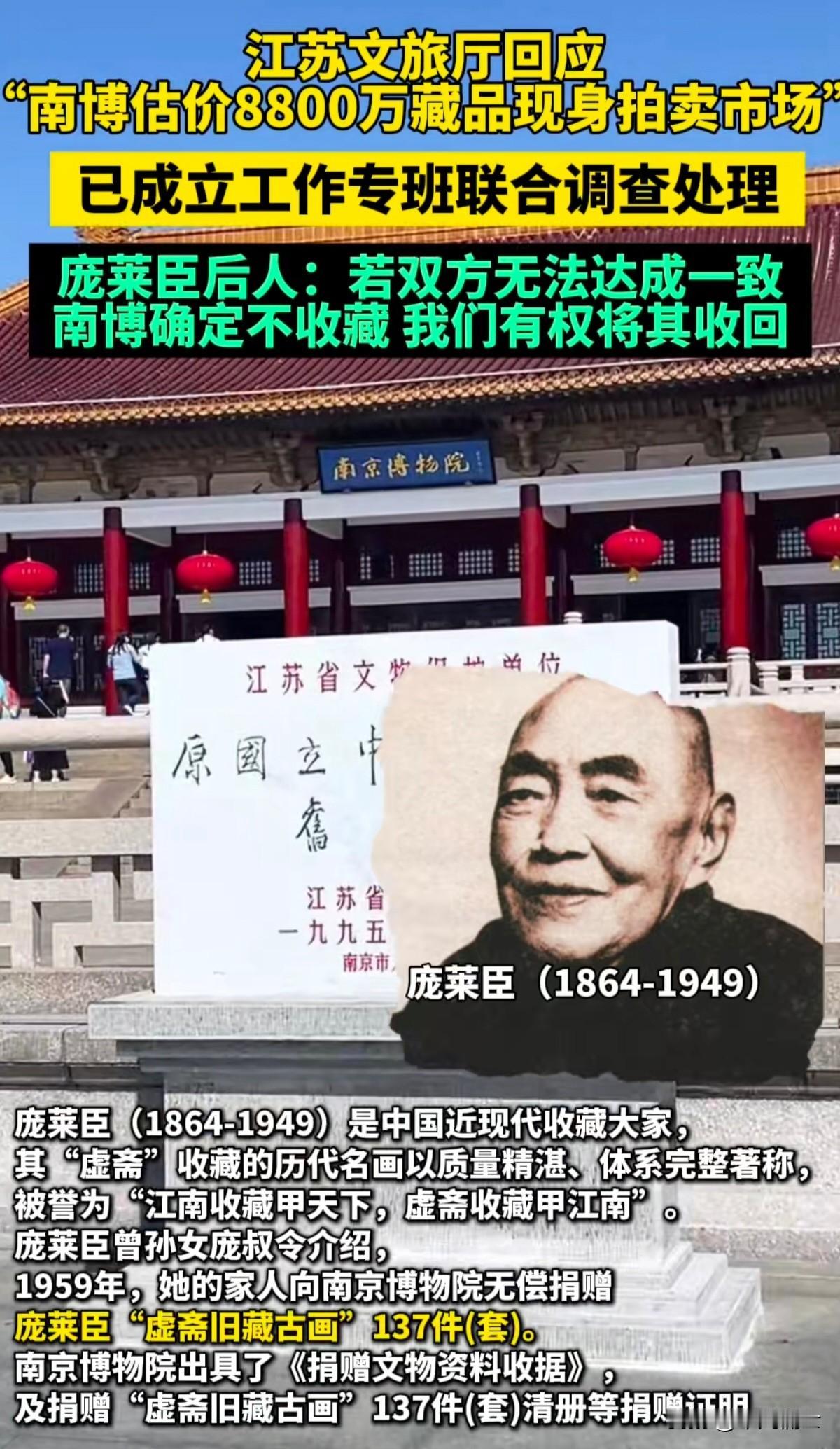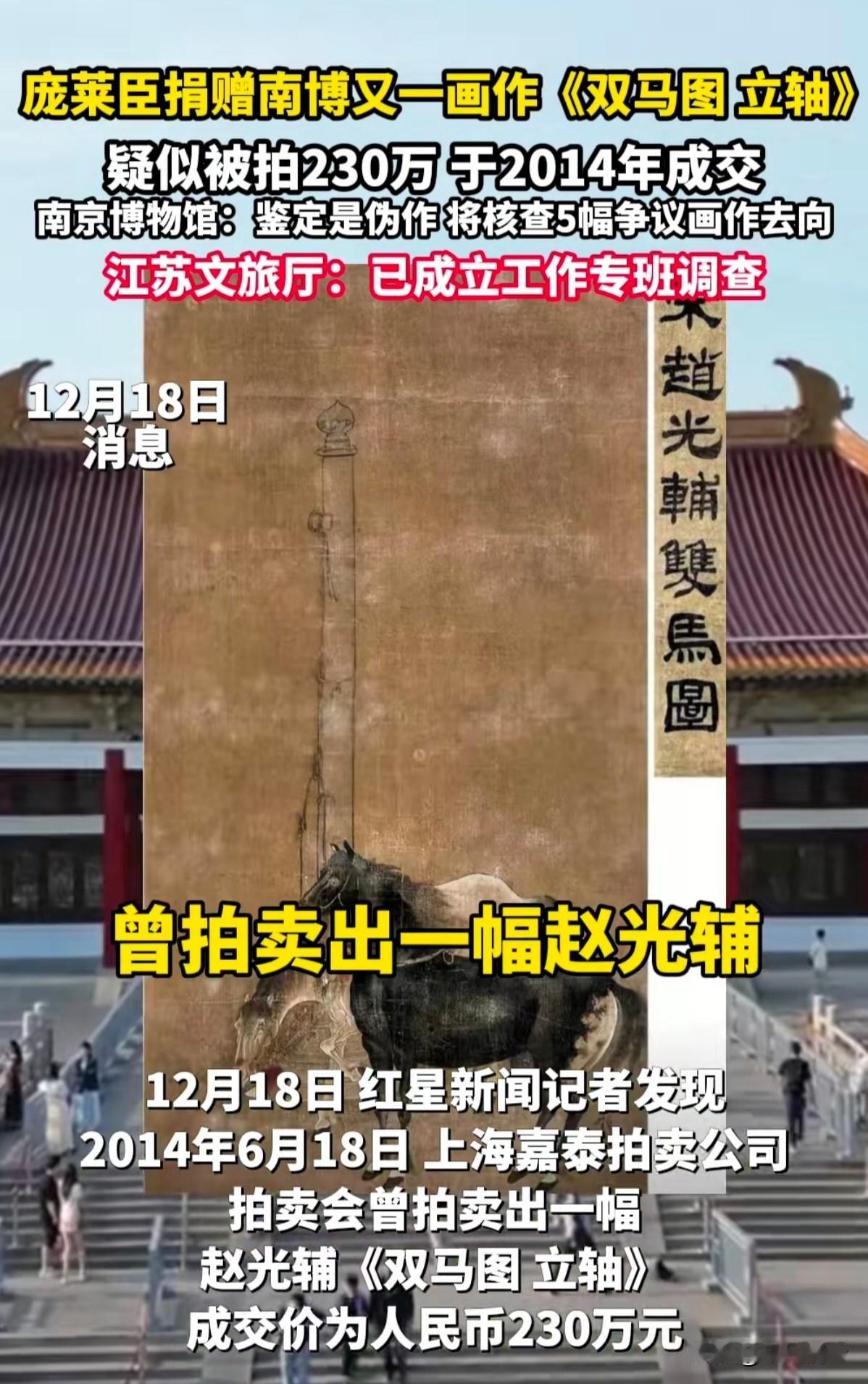 整个网络在南京博物院受捐明代仇英画作疑似进入拍卖市场事件上做了“有罪推断”,这可能把这个事件带向了错误的方向。虽然南京博物院进行了说明,但只言片语和含糊其辞无法堵住悠悠之口,甚至让整个行业陷入信任危机。其实,大家应该先搞清楚以下几个问题,才能进行下一步的质疑。 第一,拍卖行里的那幅画能不能确定就是庞莱臣后人捐赠给南京博物院的那幅画; 第二,除了南京博物院这幅画之外,在书画市场上有没有出现过关于仇英《江南春》画作的其他流通版本; 第三,是谁委托给拍卖行拍卖这幅画,这极有可能是说清问题的关键所在。 说清楚了以上几件事情,才能确定需不需要追求南京博物院和相关人员的责任。既然南京博物院已经说明把捐赠画作鉴定为赝品,但无论何种理由都应该给社会公众一个能信服的答案,你们没有权利处理捐赠者的赠品,即使是假的也应该进行封存或者退还捐赠者。这涉及文物的流失,又是从国家重要的文保单位丢失,文物等级和价值颇高,仅文旅部门的调查只能是内部调查,不会出现有说服力的结果。那就应该由公安部门介入调查,才能给大众一个可以信赖的结果,才能恢复大家对文保单位的信任。大家认为是不是呢!