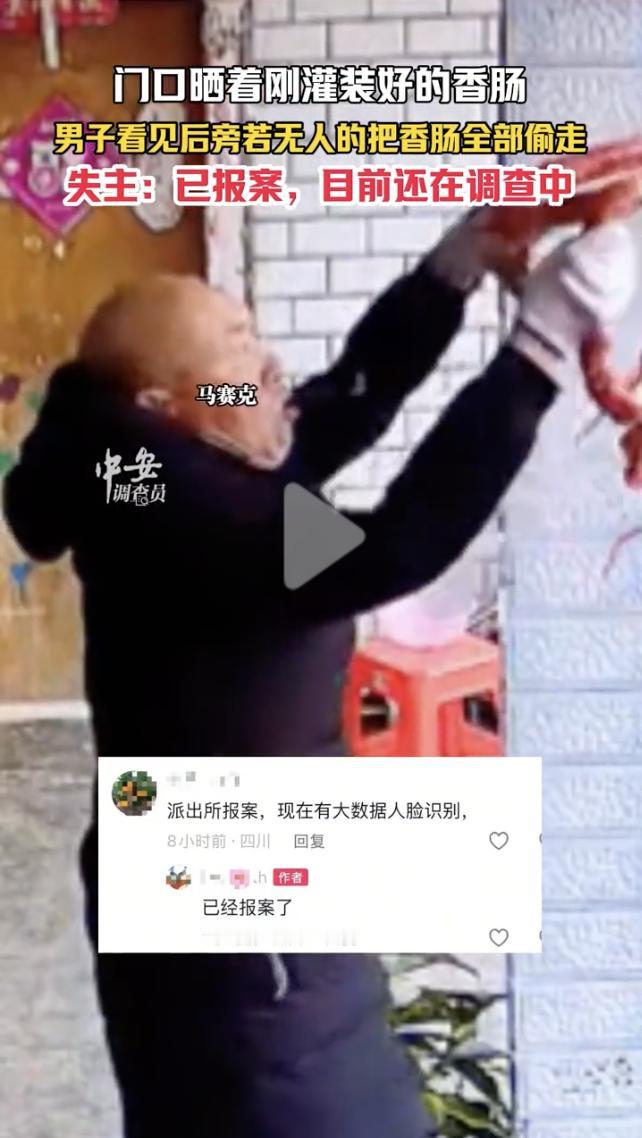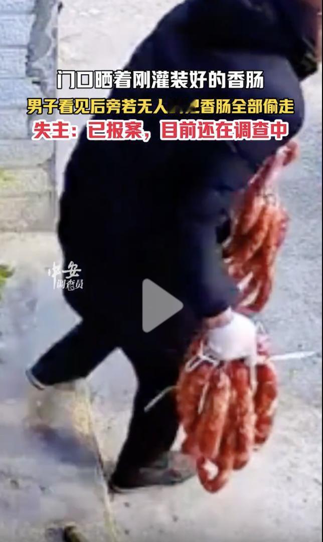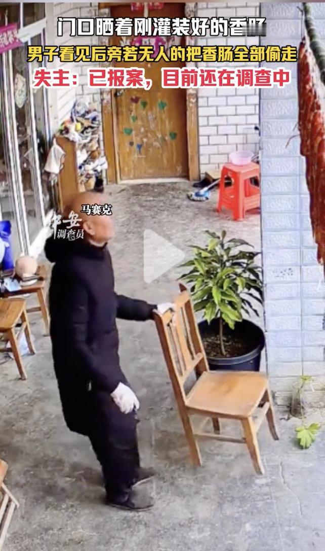 这下出名了,不仅四川人民知道了,全国人都知道了! 12月17日,四川成都,一户农家把刚灌好的香肠挂在门口晾晒,香肠很多,三四米长的竹竿都挂满了,然而让主人没想到的是,不久后意外发生了。 香肠挂上后不久,一名路过的男子发现了正在晾晒的香肠,男子先是悄悄的走到农户门前,观察后发现农户家里并没有人,于是男子从旁边搬过来一把椅子,爬上椅子开始用手去拽竹竿上的香肠。 因为香肠很重,又都是一节一节连在一起的,再加上挂的比较高,男子站在椅子上使不上劲,所以男子拽了半天也没拽掉,最后男子使劲一拽,把整个竹竿都拽落在地上。 男子动作麻利的把掉在地上的香肠捡起来,两只手一手拎着一捆香肠,然后快步逃离了现场,只留下那根挂香肠的竹竿,孤零零的躺在地上。 农家主人回家后发现挂在门口的香肠不见了,于是立刻查看了监控,发现了男子偷窃香肠的全过程后,主人立刻报了警。 估计男子偷窃香肠时,也没想到人家门口安装了监控,更没想到自己偷香肠的整个过程,自己的衣着相貌和一举一动都被监控拍的清清楚楚。现在大数据这么厉害,有这么清晰的照片,相信很快就可以查到男子。 不得不说,这个偷香肠的男子真是太丢人了,看见人家门口挂的香肠就见财起意,顺手牵羊给人家偷走了,关键是偷的时候嘴里还叼着烟,气定神闲,伸手老练,一看就是个经常偷鸡摸狗的惯犯。 这下好了,全国网友都知道这个男子偷香肠的事了,这么清晰的监控视频,亲朋好友街坊邻居一看就知道是谁,不知道这个男子以后还怎么出门?怎么有脸见人?