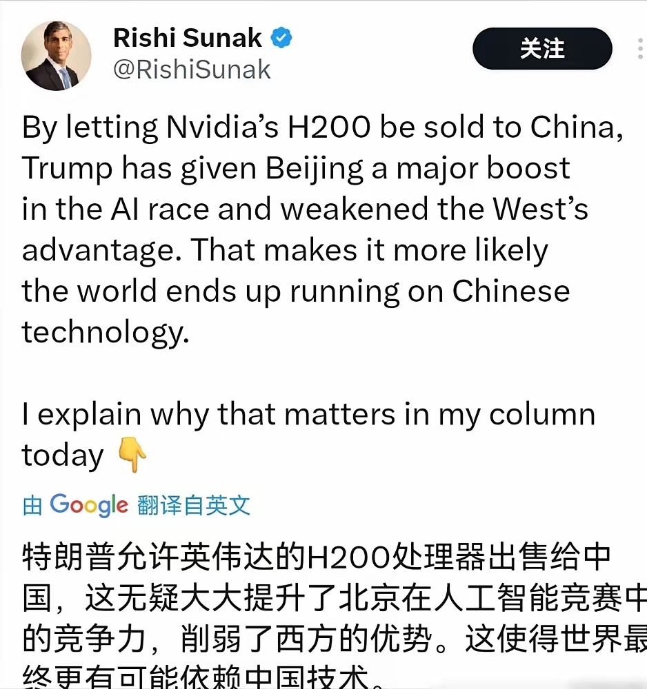 英国前首相苏纳克发文:“特朗普允许英伟达的H200销售给中国,这给了北京在AI竞赛中巨大的助力,并削弱了西方的优势。这让世界最终依赖中国技术的可能性变得更大。”这个阿三挺操心的!