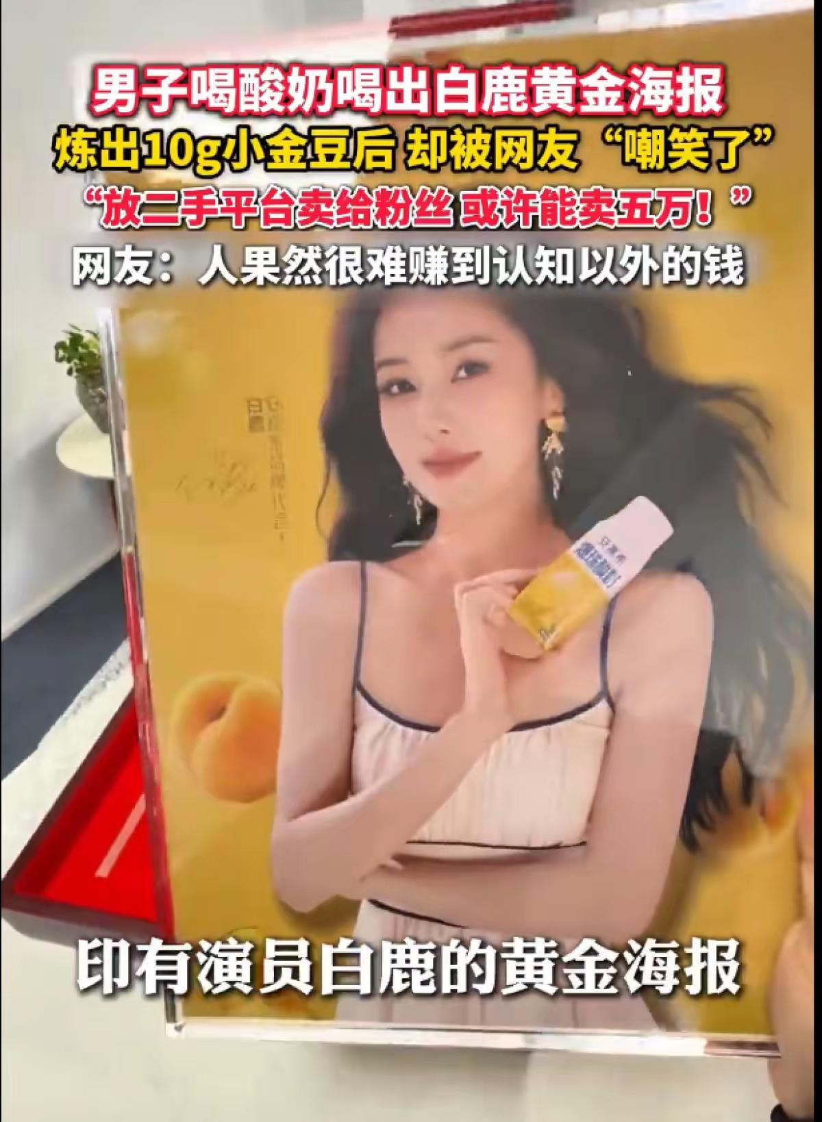 亏大了,小伙是后悔也晚了,捡了芝麻丢了西瓜。 事情的起因呢,是因为小伙喝酸奶中奖了,中了一张印有明星白鹿的一张黄金海报,这开心的男子,并不懂白鹿的海报的珍贵。 隔天就跑到金店,把白鹿海报的背面黄金全部撕下融化成一枚金豆子。 金豆子大概有10克,笑嘻嘻的认为自己赚了9000多元,可是这视频发到网上后,这网友直呼可惜了。 网友称这海报放在一般的二手平台上售卖的话,价格肯定是能够售卖5万,一听到这消息,小伙子也是后悔莫及啊。早知道先去问问这市场的行情了。 通过这件事也明白,不是所有人都了解明星。