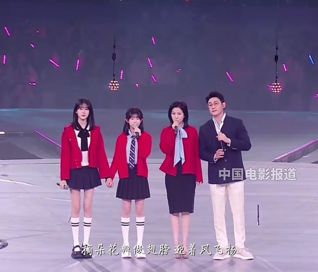 12月18日,陆毅和鲍蕾夫妻俩带着两个女儿参加中国电影120周年活力之夜,一家人能够在舞台参演让人羡慕,一家人演唱了《萱草花》。 鲍蕾穿着红色上衣,和黑色裙子和皮鞋,脖子上系着浅灰蓝色围脖。贝尔和小叶子穿着和妈妈同款红色上衣,两人系着学生领带,穿着白色长袜。陆毅戴着眼镜,穿的很时尚。 一家人好有颜值,在台上深情演唱,满满的幸福感。