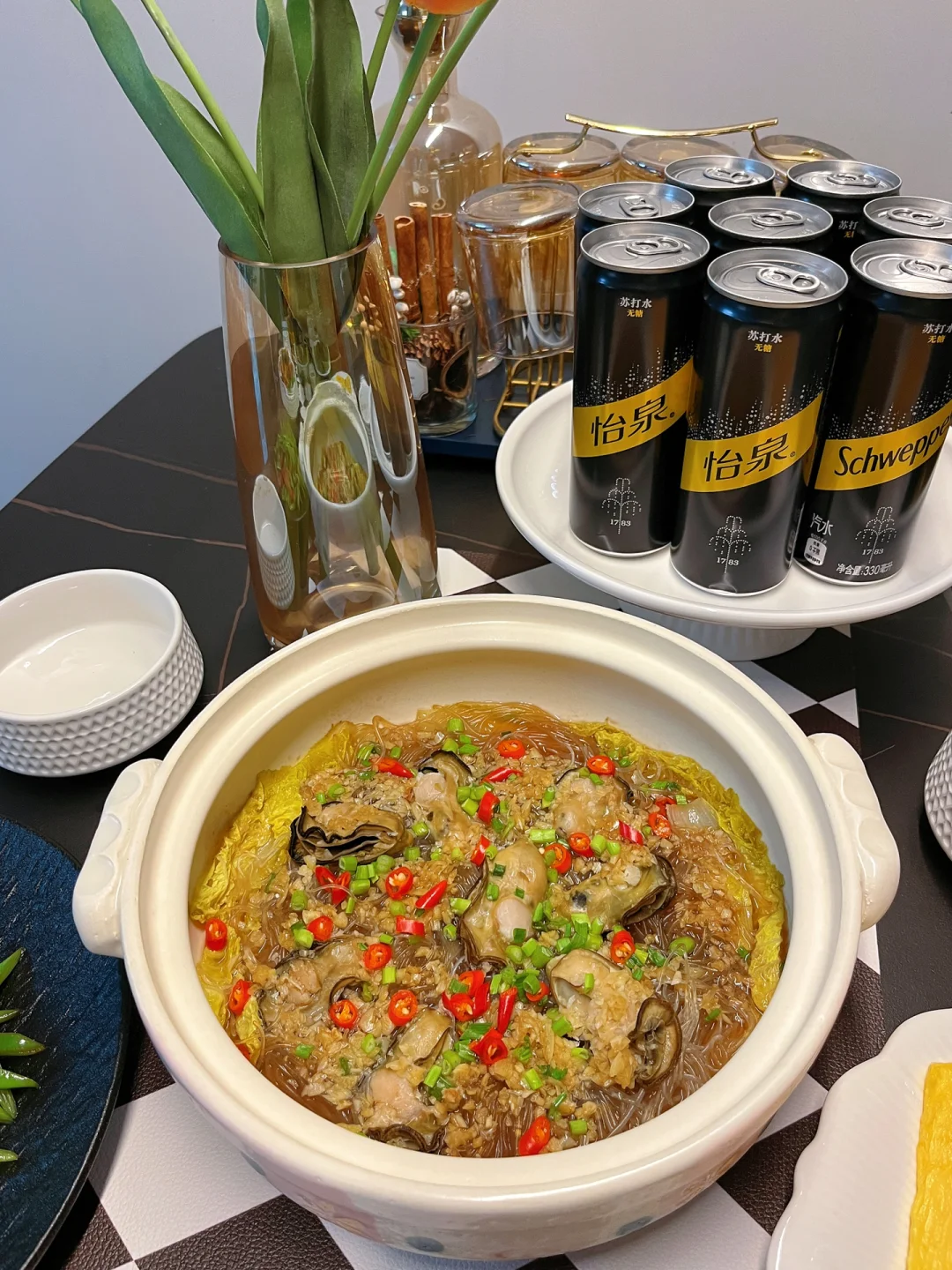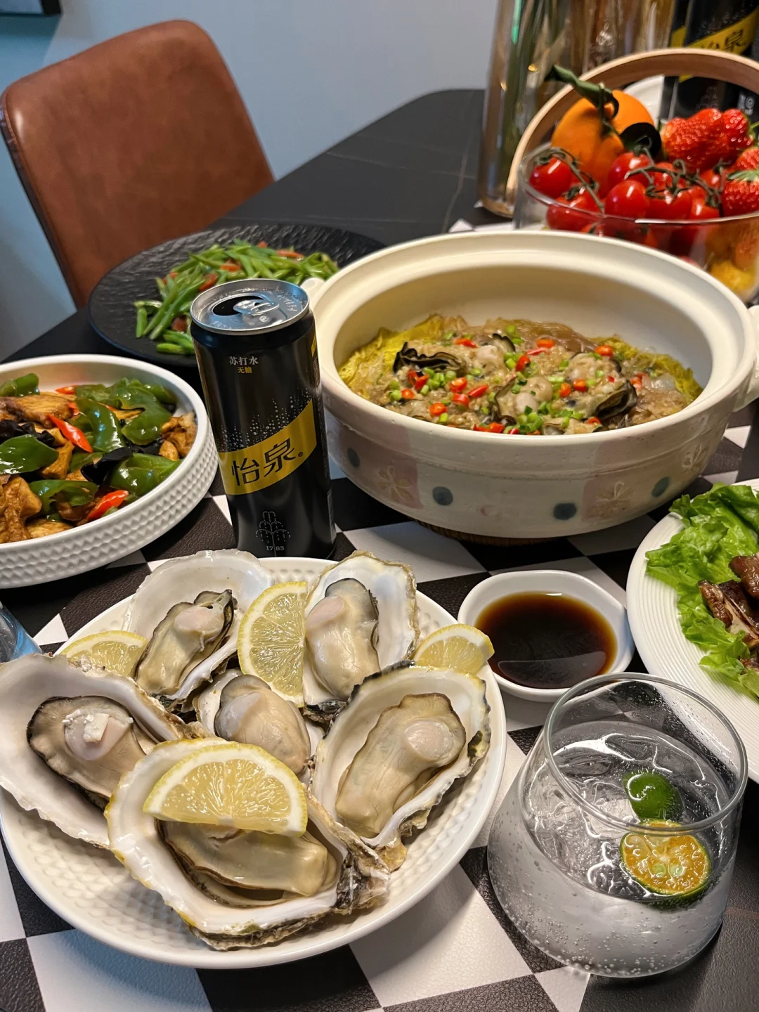 今天这顿吃的可满足了~生蚝是来自日照的闺蜜寄来的,知道我馋生蚝很久了!今天做了蒜蓉和清蒸两种口味,再搭配上怡泉苏打水那叫一个满足~